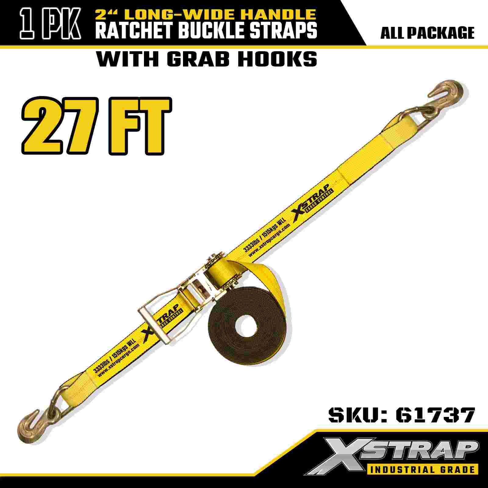 Xstrap 61737 Heavy Duty 2" x 27' 1PK Ratschengurt mit Haltehaken, gelb, Tragfähigkeit 3.333 lbs, langer Ratschengurt mit breitem Griff für Maschinen und Geräte