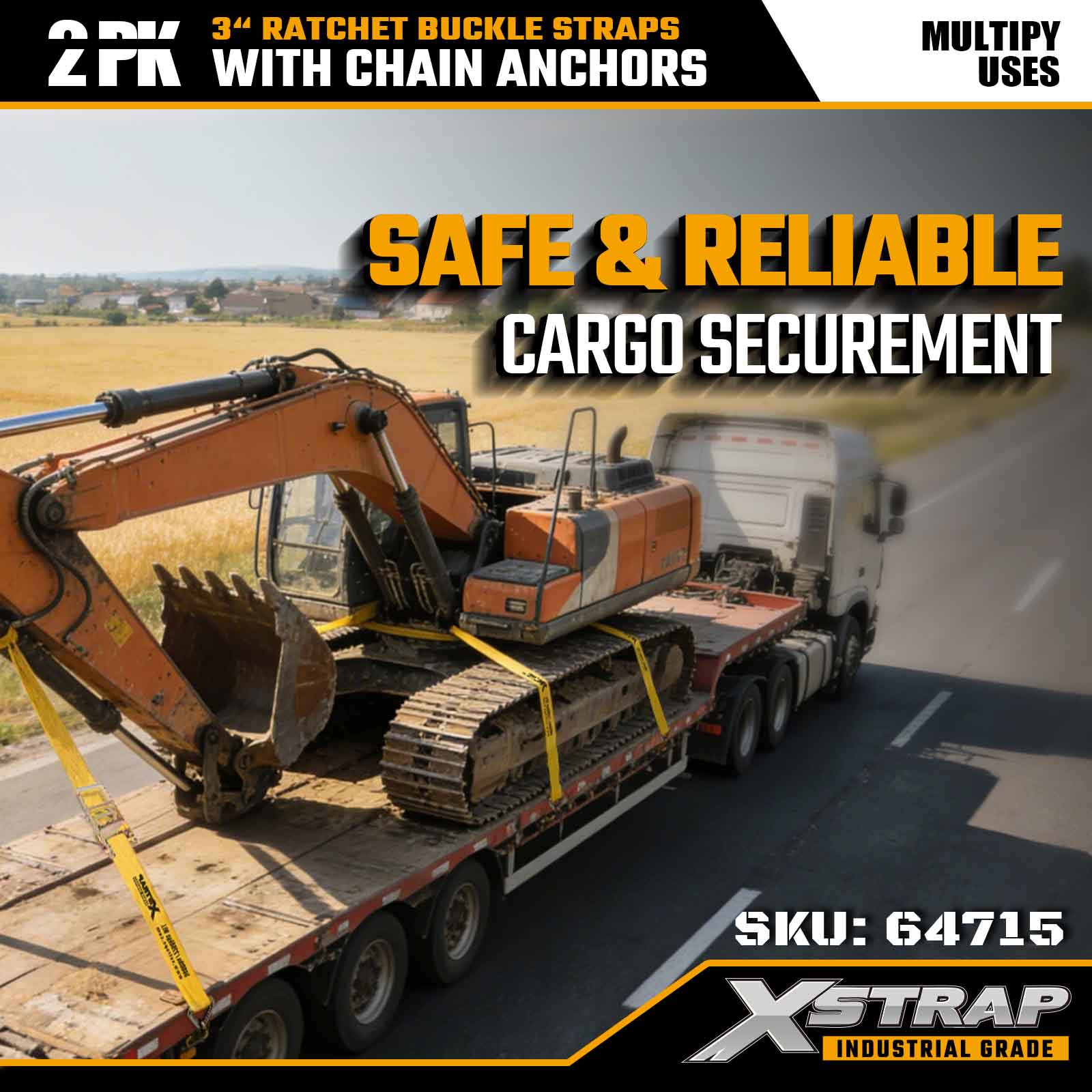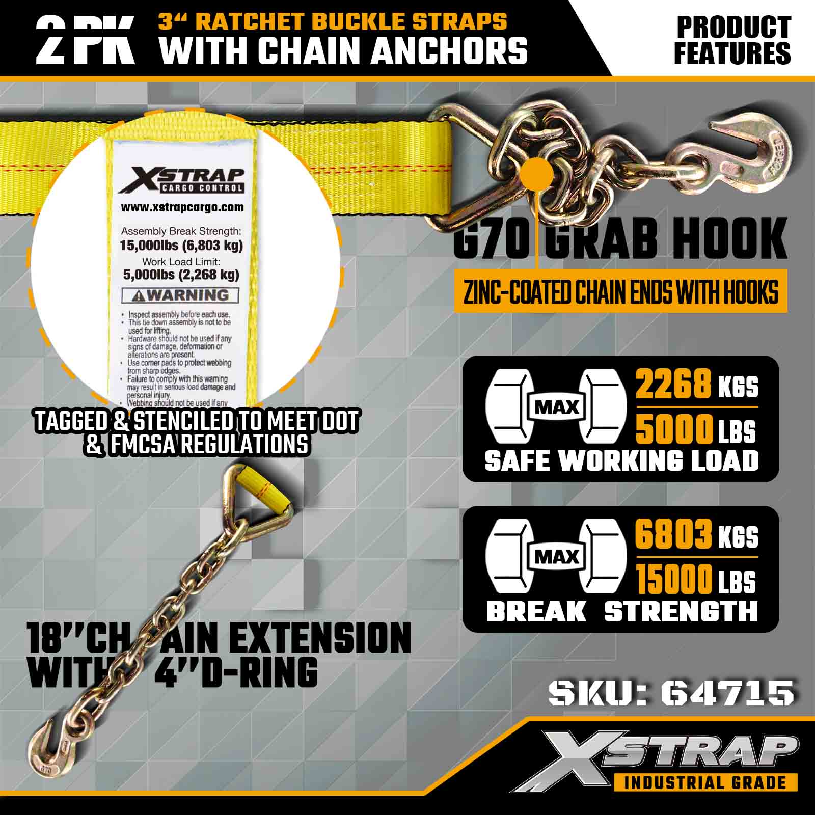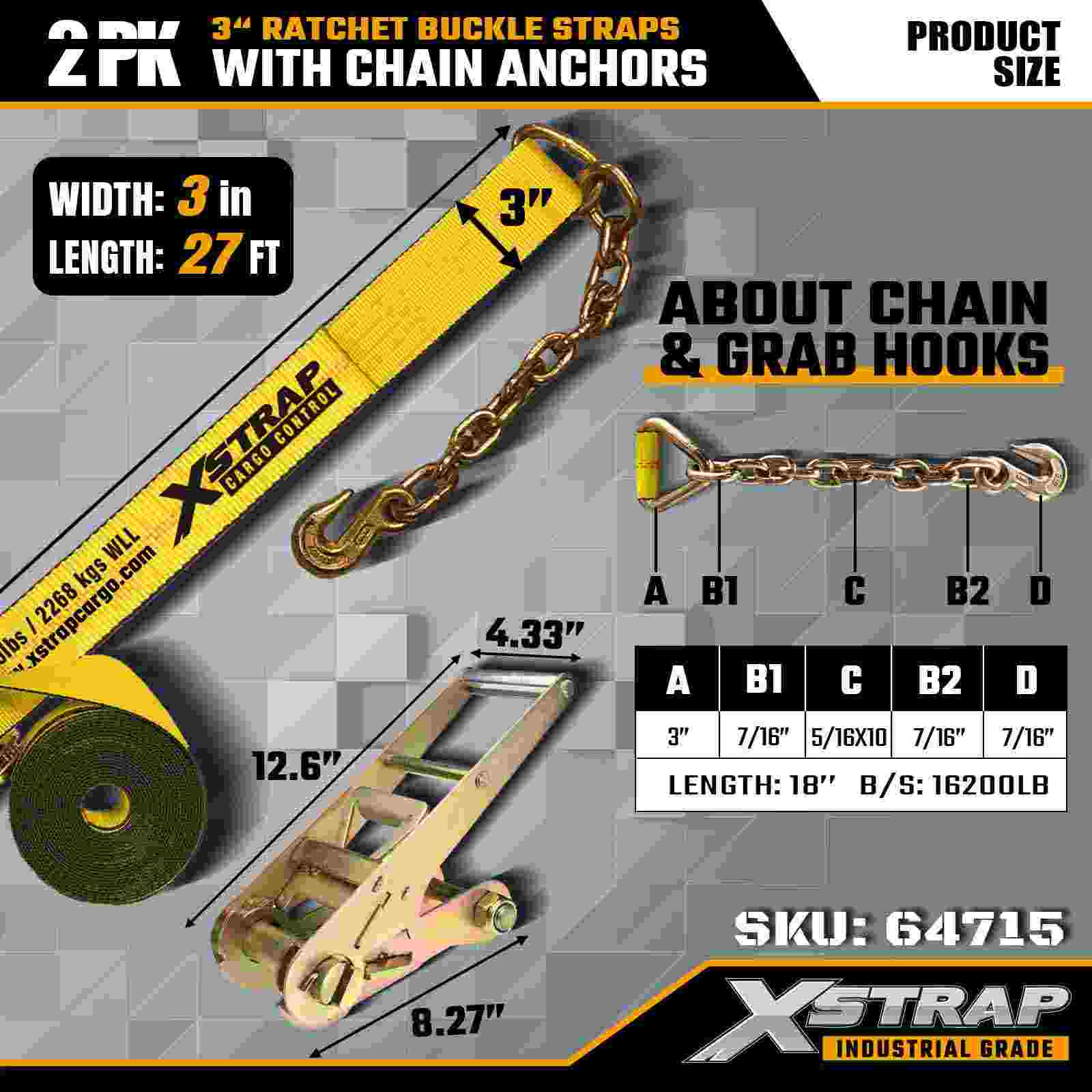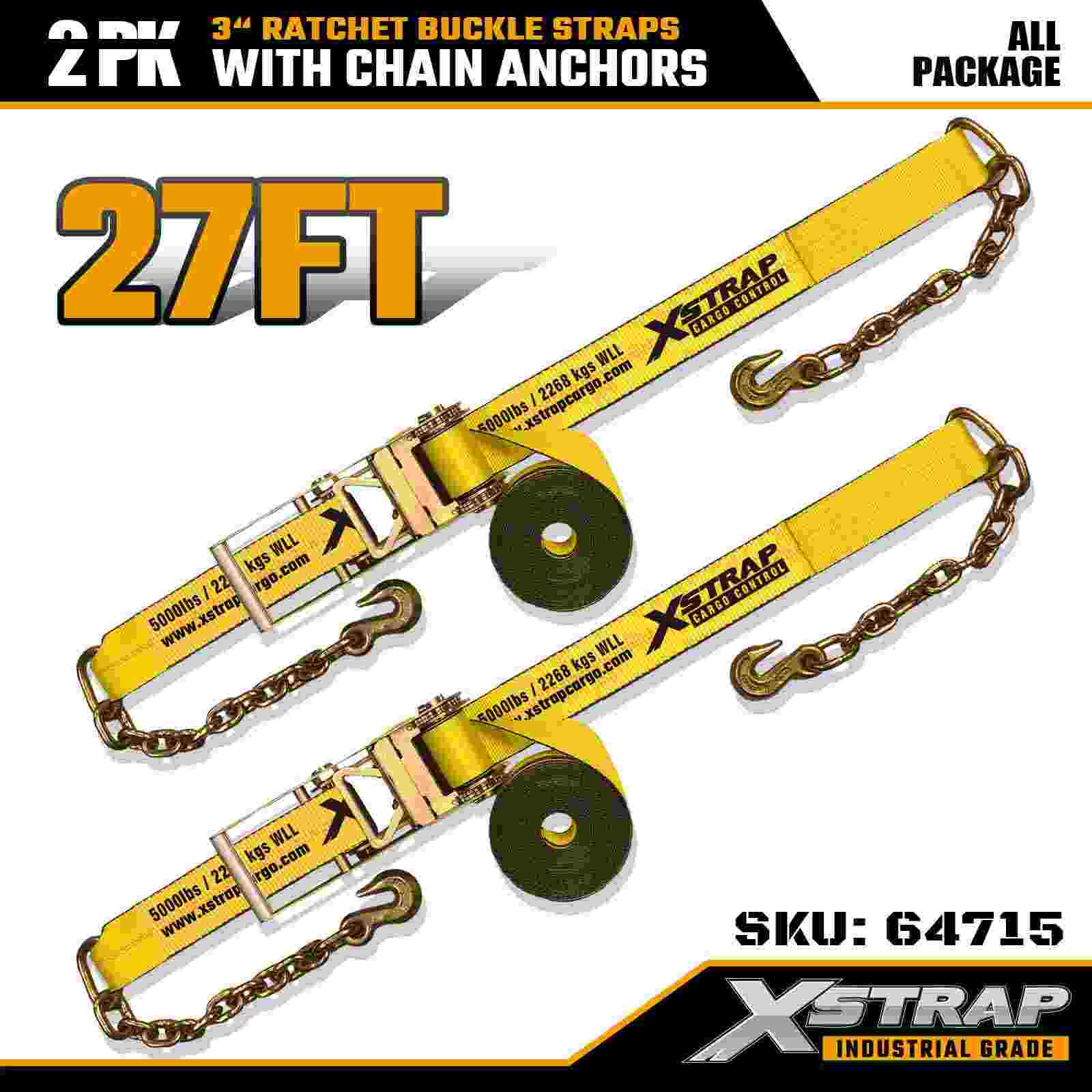 Xstrap 64715 3" × 27 Fuß Ratschenschnallengurte (2er-Pack) – ausgestattet mit robusten Kettenankern, entwickelt für anspruchsvolle Frachtumgebungen. Mit einer Arbeitslastgrenze von 5.000 Pfund und einer Bruchfestigkeit von 15.000 Pfund bieten diese Gurte eine sichere, stabile und professionelle Zurrleistung für Tieflader, Maschinentransporte und Industrietransporte.