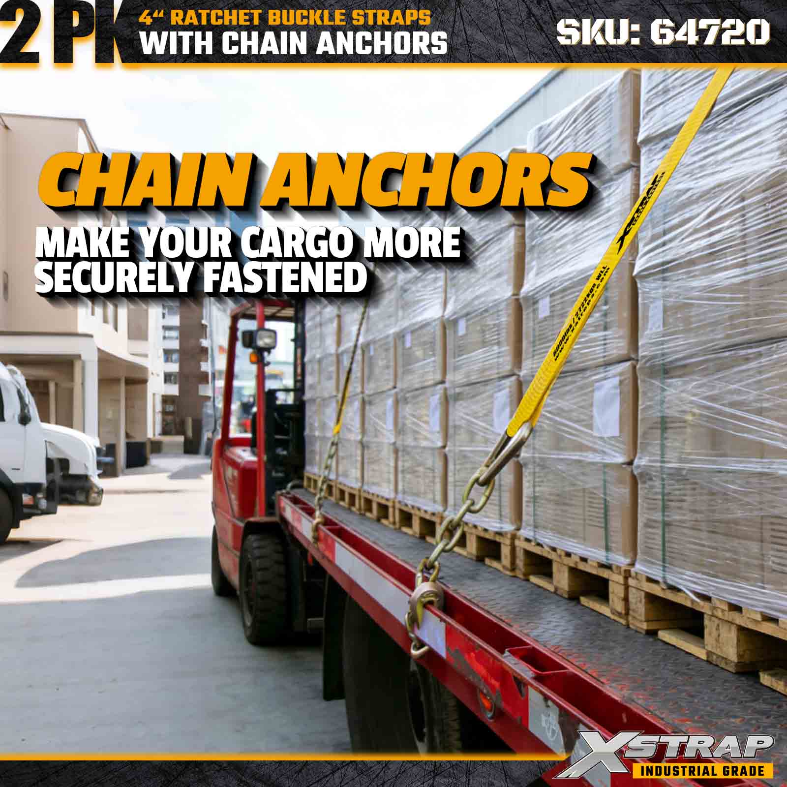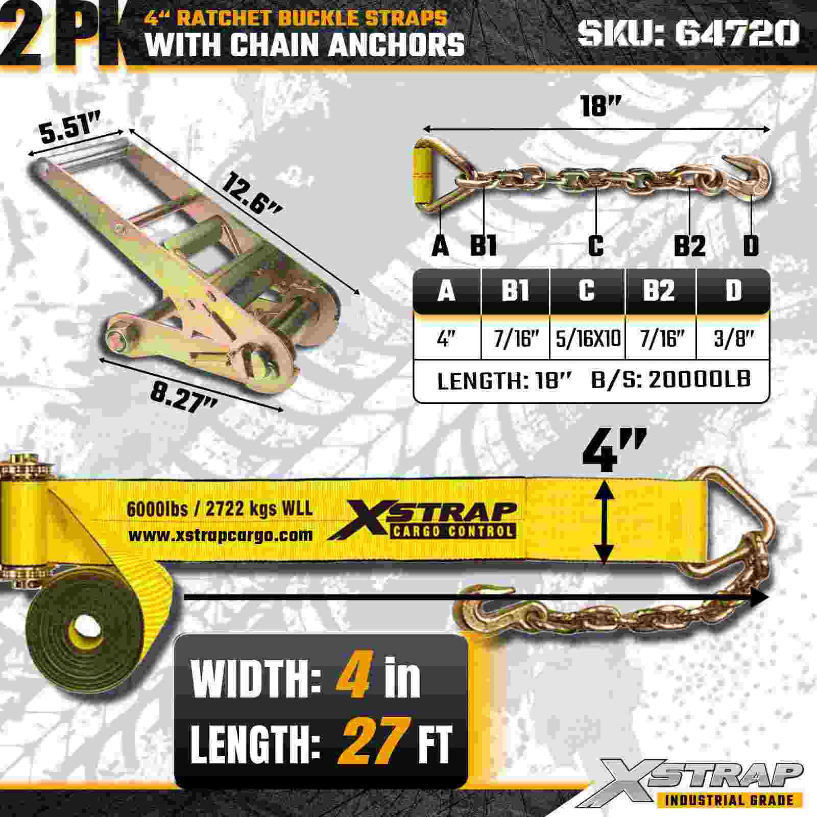 Die Xstrap 64720 4" × 27 Fuß Ratschenschnallengurte (2er-Pack) sind für die Ladungssicherung unter schweren Lasten konzipiert und verfügen über robuste Kettenanker und einen verstärkten Ratschenmechanismus. Mit einer Arbeitslastgrenze von 6.000 Pfund und einer Bruchfestigkeit von 18.000 Pfund sind diese Gurte ideal für den Tiefladertransport, den Maschinentransport, Stahlladungen und industrielle Frachtanwendungen, die maximale Festigkeit und Zuverlässigkeit erfordern.