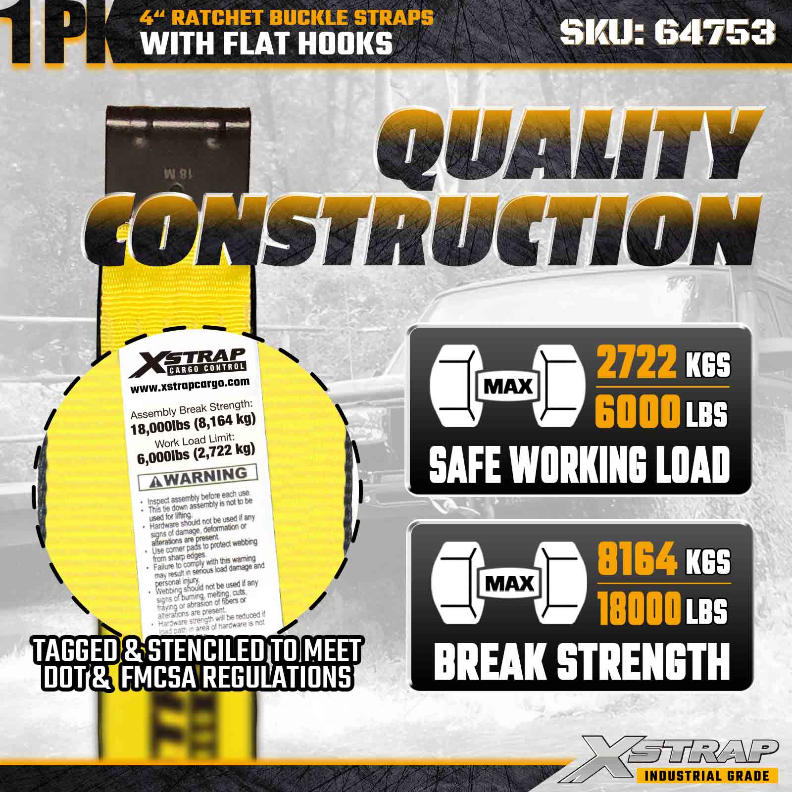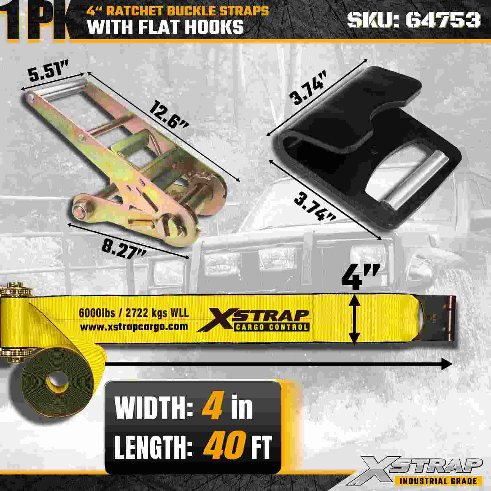 Der Xstrap 64753 4" × 40 Fuß Ratschenschnallengurt (1er-Pack) ist für die Ladungssicherung unter schweren Lasten konzipiert und verfügt über verstärkte Flachhaken und einen langlebigen Ratschenmechanismus. Mit einer Arbeitslastgrenze von 6.000 Pfund und einer Bruchfestigkeit von 18.000 Pfund ist dieser extralange Gurt ideal für den Tiefladertransport, übergroße Lasten, den Maschinentransport und industrielle Frachtanwendungen.