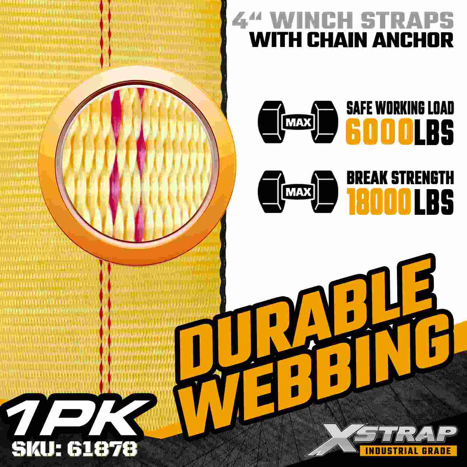 Der Xstrap 61878 4" × 27 Fuß Standard-Windengurt ist ein hochbelastbarer industrieller Ladungssicherungsgurt, der für Tiefladeranhänger und extreme Lastbedingungen entwickelt wurde. Ausgestattet mit einem geschmiedeten Kettenanker und einem extrem breiten 4-Zoll-Polyestergewebe bietet dieser 4-Zoll-Windengurt eine Arbeitslastgrenze von 6.000 Pfund und eine Bruchfestigkeit von 18.000 Pfund. Das Design des Kettenankers bietet unübertroffenen Halt und Haltbarkeit und eignet sich daher ideal zum Sichern von Stahl, Maschinen und andere Hochspannungsgüter.