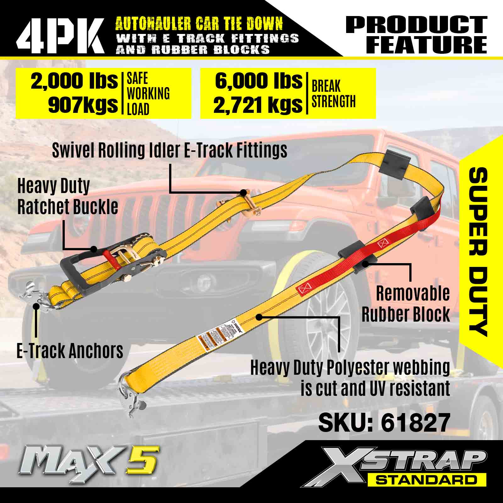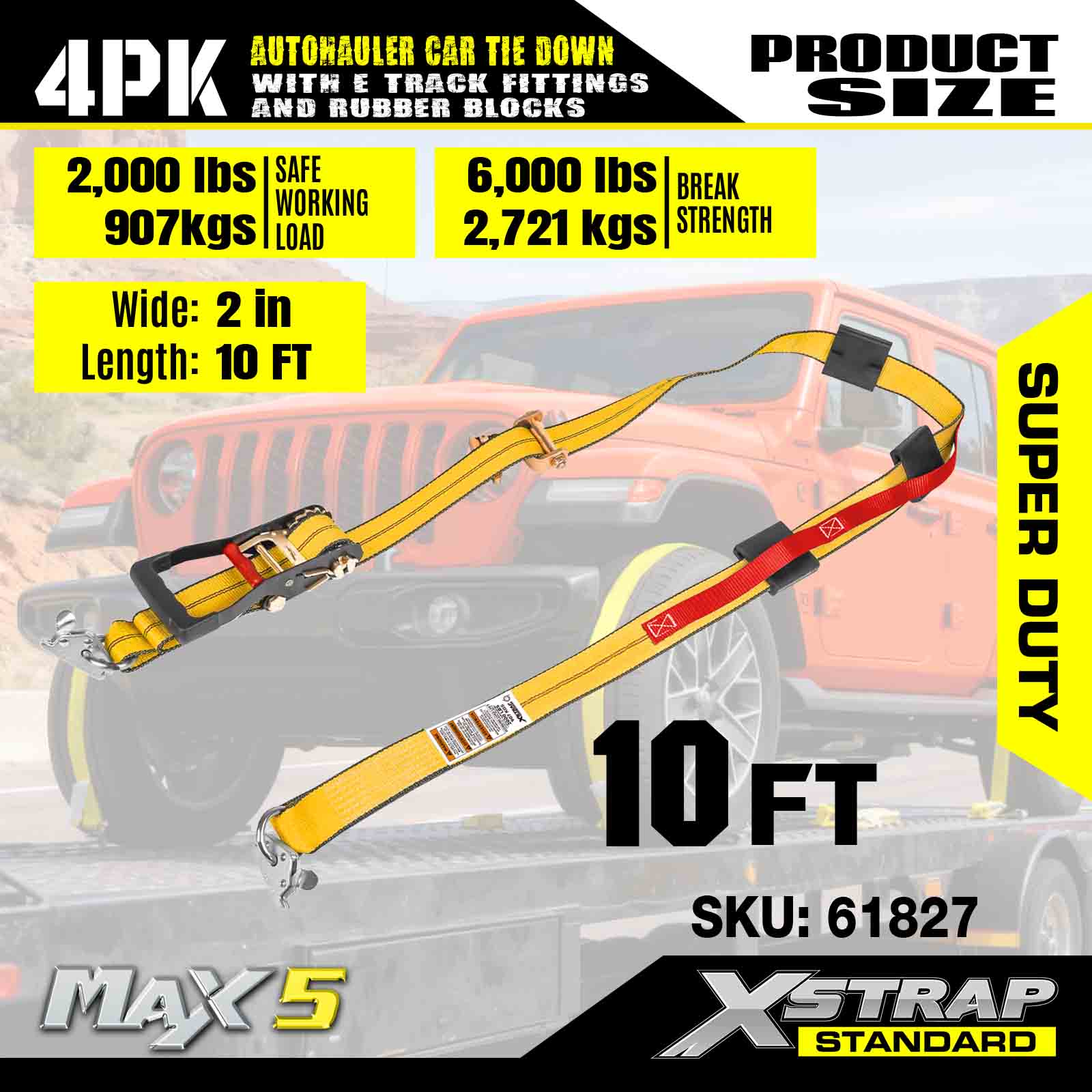 - Sicherheit und Vielseitigkeit: Mit einer Arbeitslastgrenze von 2.000 Pfund und einer Bruchfestigkeit von 6.000 Pfund bieten diese Gurte zuverlässige Sicherheit für Geländefahrzeuge, LKWs, Geländefahrzeuge und UTVs – ideal für anspruchsvolle Transportanforderungen