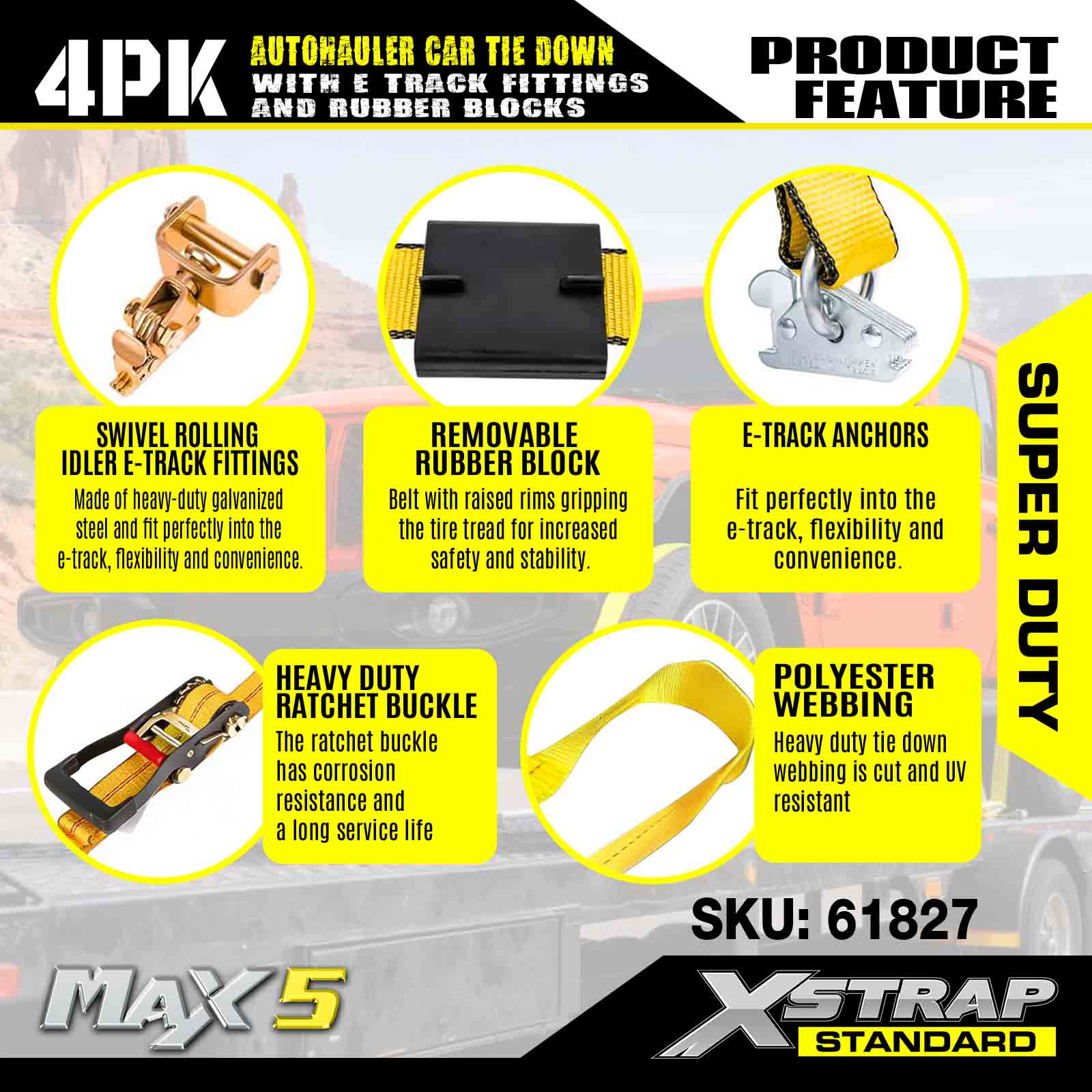 - Strapazierfähige Hardware: Verfügt über korrosionsbeständige Ratschenschnallen und robuste E-Track-Anker, die eine sichere und langlebige Befestigung für alle Ihre Transportanforderungen für schwere Autos gewährleisten