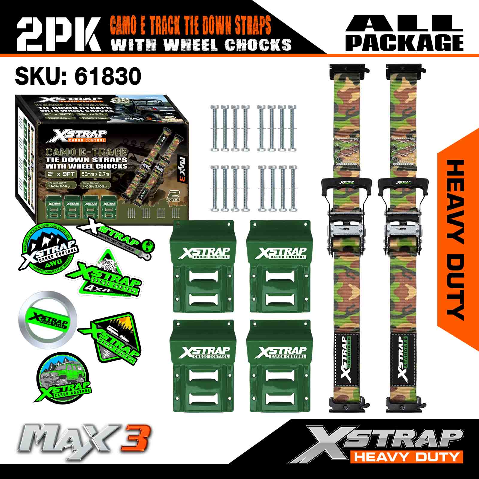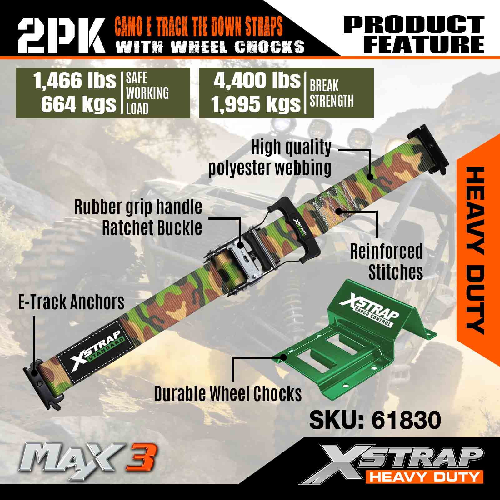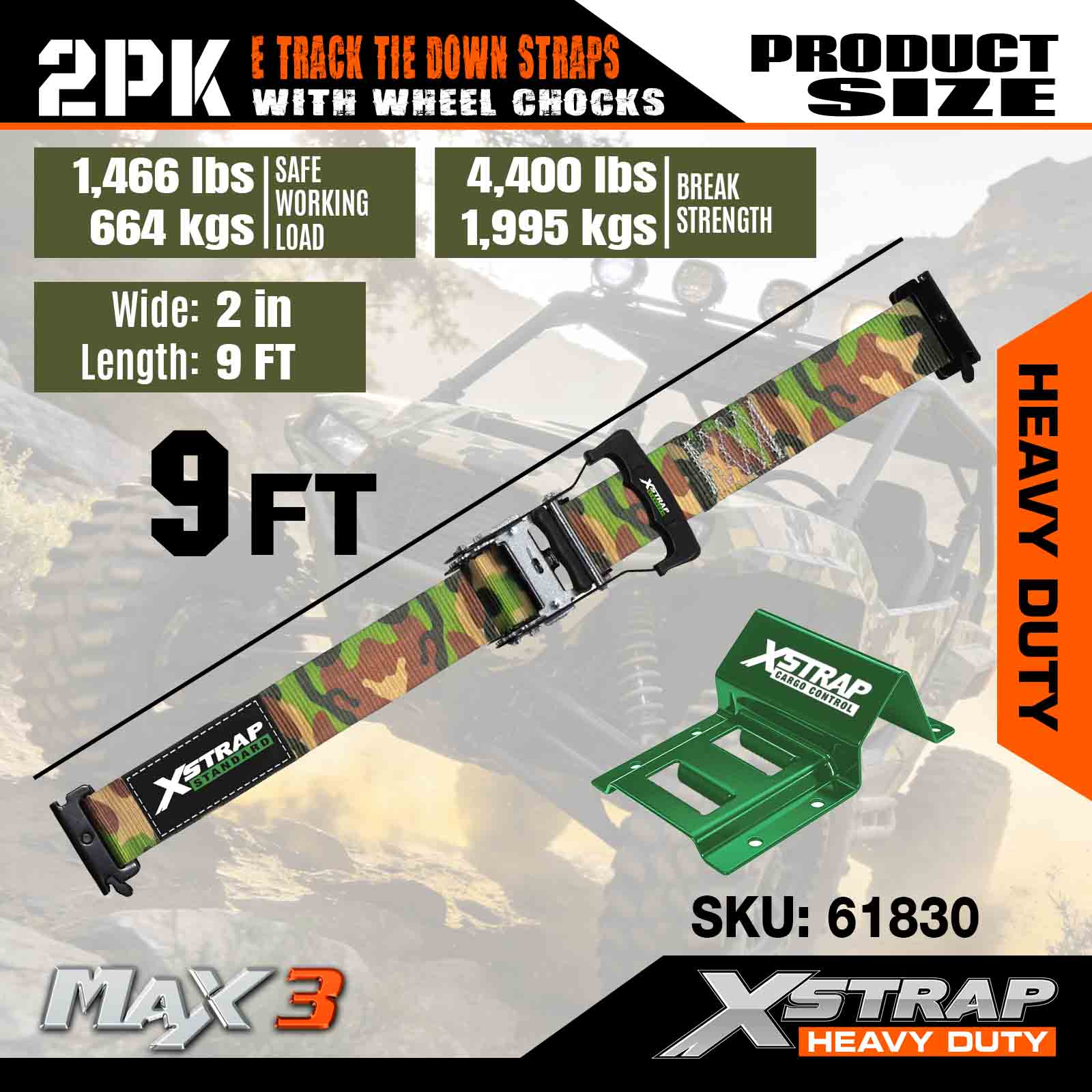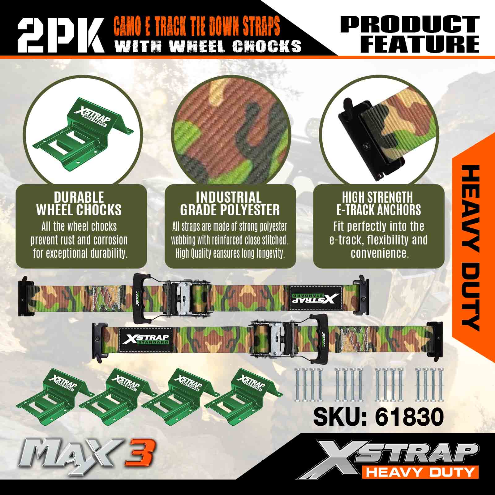 Xstrap-Unterlegkeil-Befestigungsset, 4.400 Pfund Bruchfestigkeit (2), robuste Ratschengurte für Anhängerreifen, (4) Unterlegkeile – E-Track-System für ATV, UTV, Rasenmäher, Vierräder – CAMO