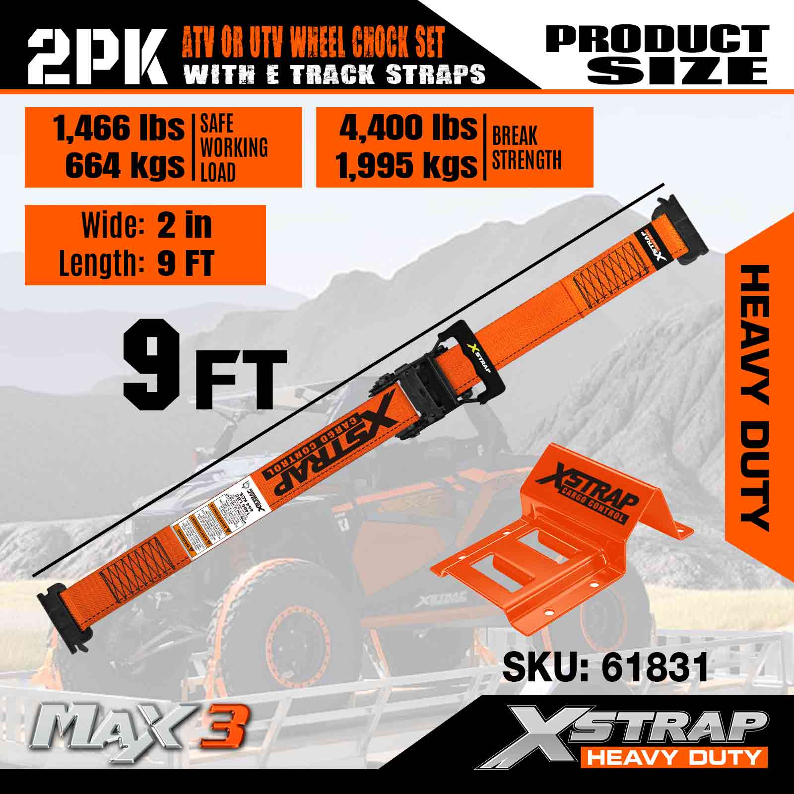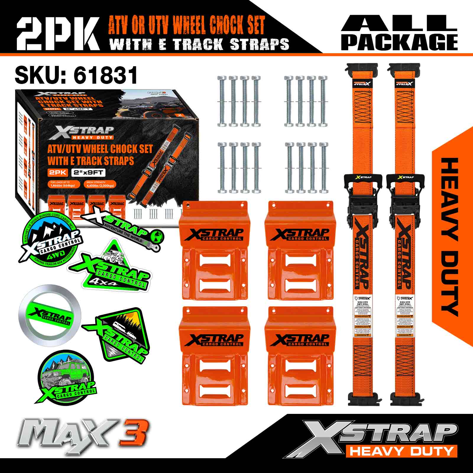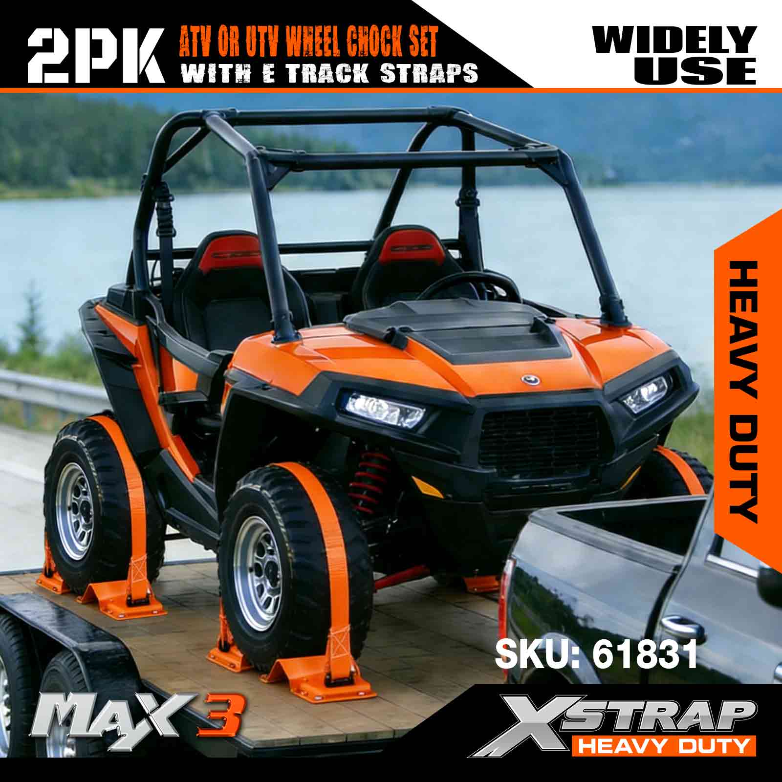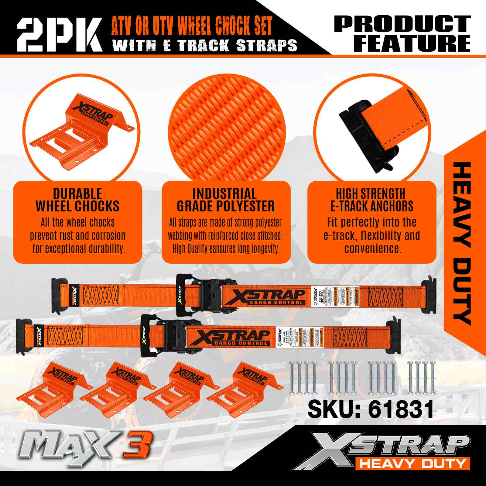 Xstrap UTV-Unterlegkeil-Spannset, 4.400 lb Bruchfestigkeit (4) Hochleistungs-Ratschengurte für Anhängerreifen (8) Unterlegkeile – E-Track-System für ATV, UTV, Rasenmäher mit vier Rädern – Orange