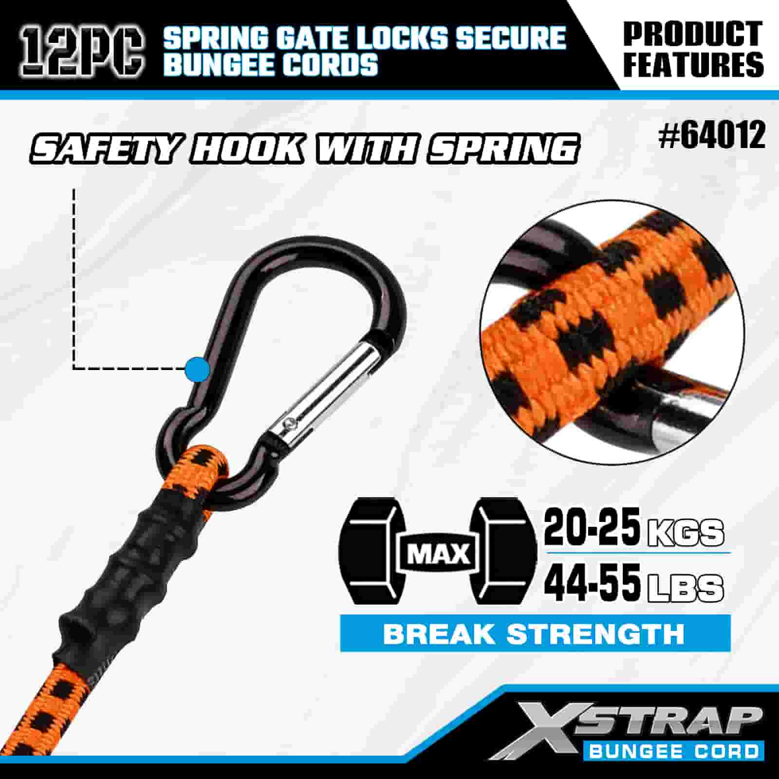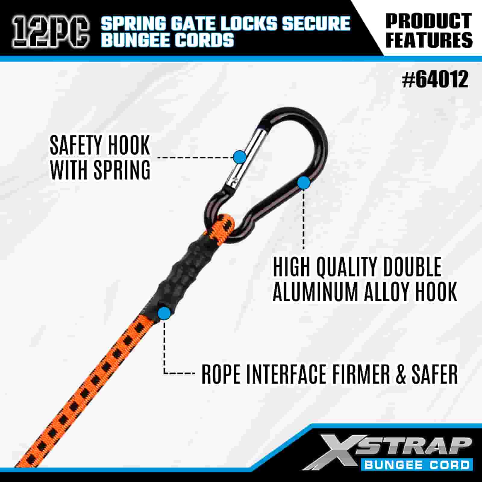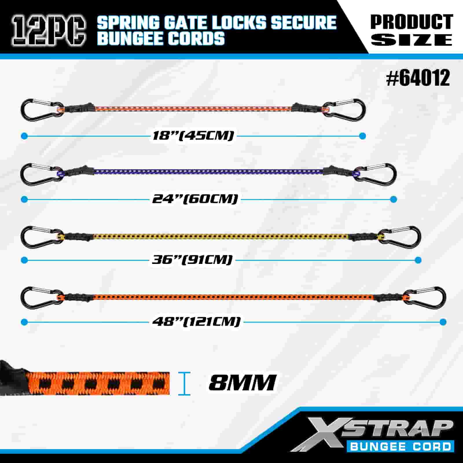 Xstrap 12 Stück Federtorschlösser sichern Bungee-Seile 8 mm x 18 Zoll/24 Zoll/36 Zoll/48 Zoll, 88–110 Pfund Bruchfestigkeit mit Karabinerhaken und sicherem Federtorschloss.