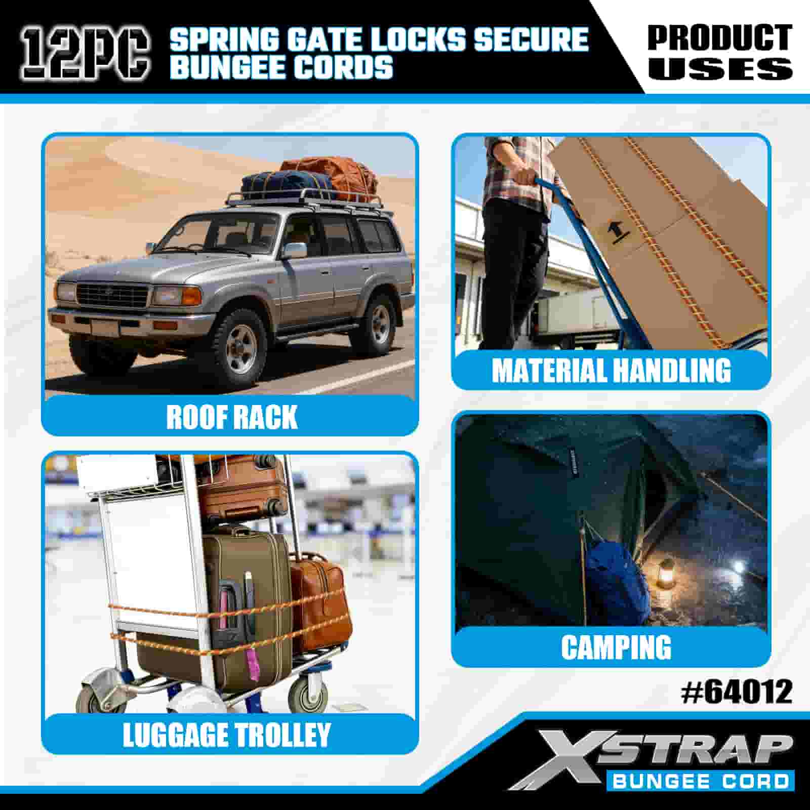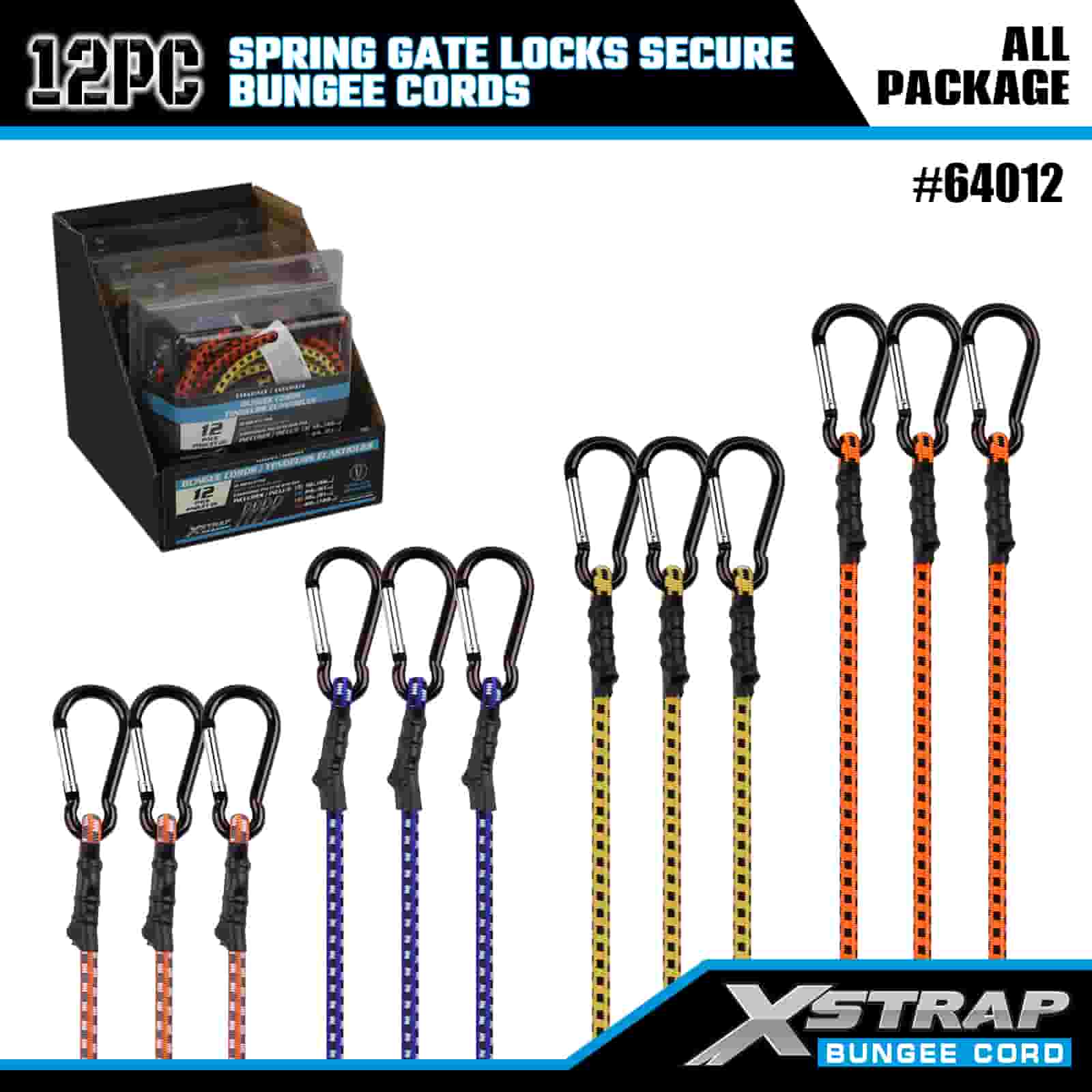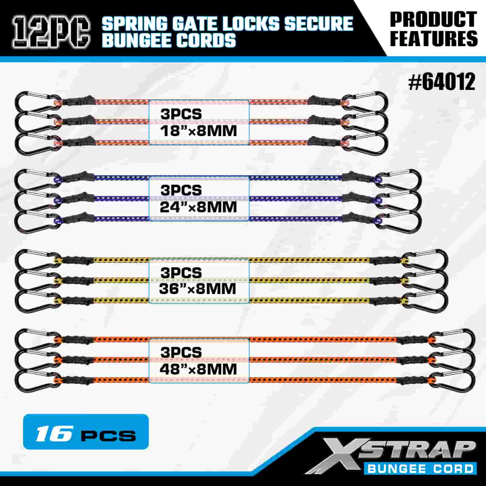 Xstrap 12 Stück Federtorschlösser sichern Bungee-Seile 8 mm x 18 Zoll/24 Zoll/36 Zoll/48 Zoll, 88–110 Pfund Bruchfestigkeit mit Karabinerhaken und sicherem Federtorschloss.