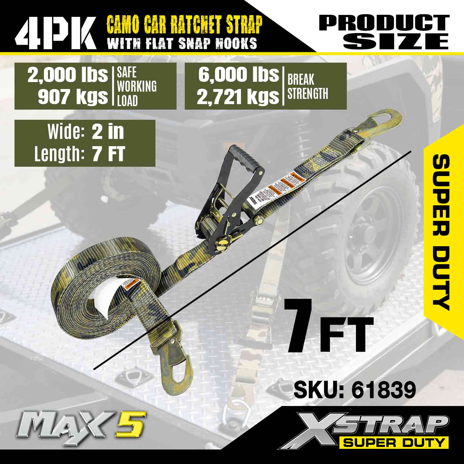 Xstrap Cargo Control Auto-Ratschengurte mit flachen Karabinerhaken 2 Zoll x 7 Fuß (4er-Pack), 6.000 Pfund Bruchfestigkeit, vielseitige Ratschengurte mit flachen Verriegelungshaken, zum Festzurren von Autos, Motorrädern und anderen Fahrzeugen