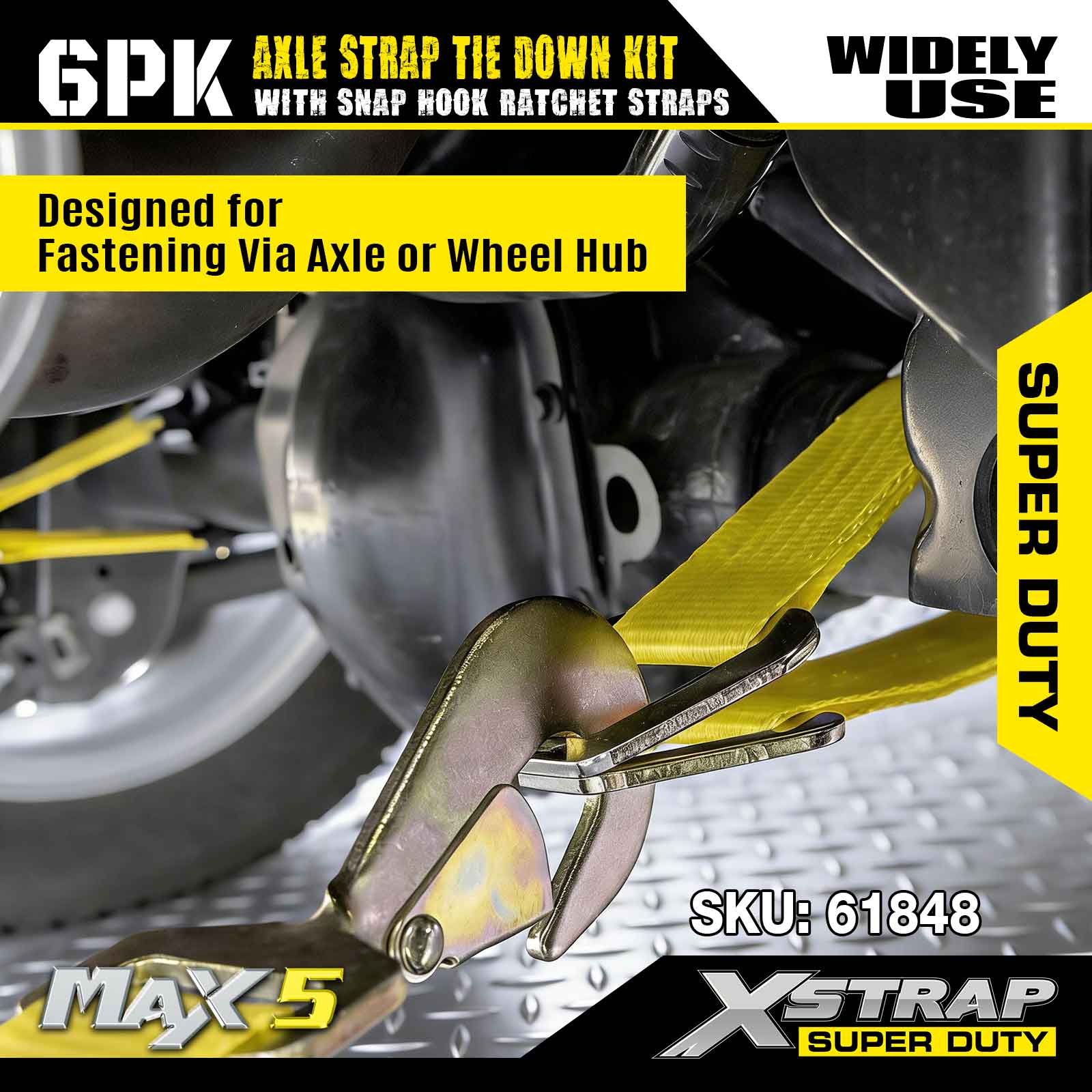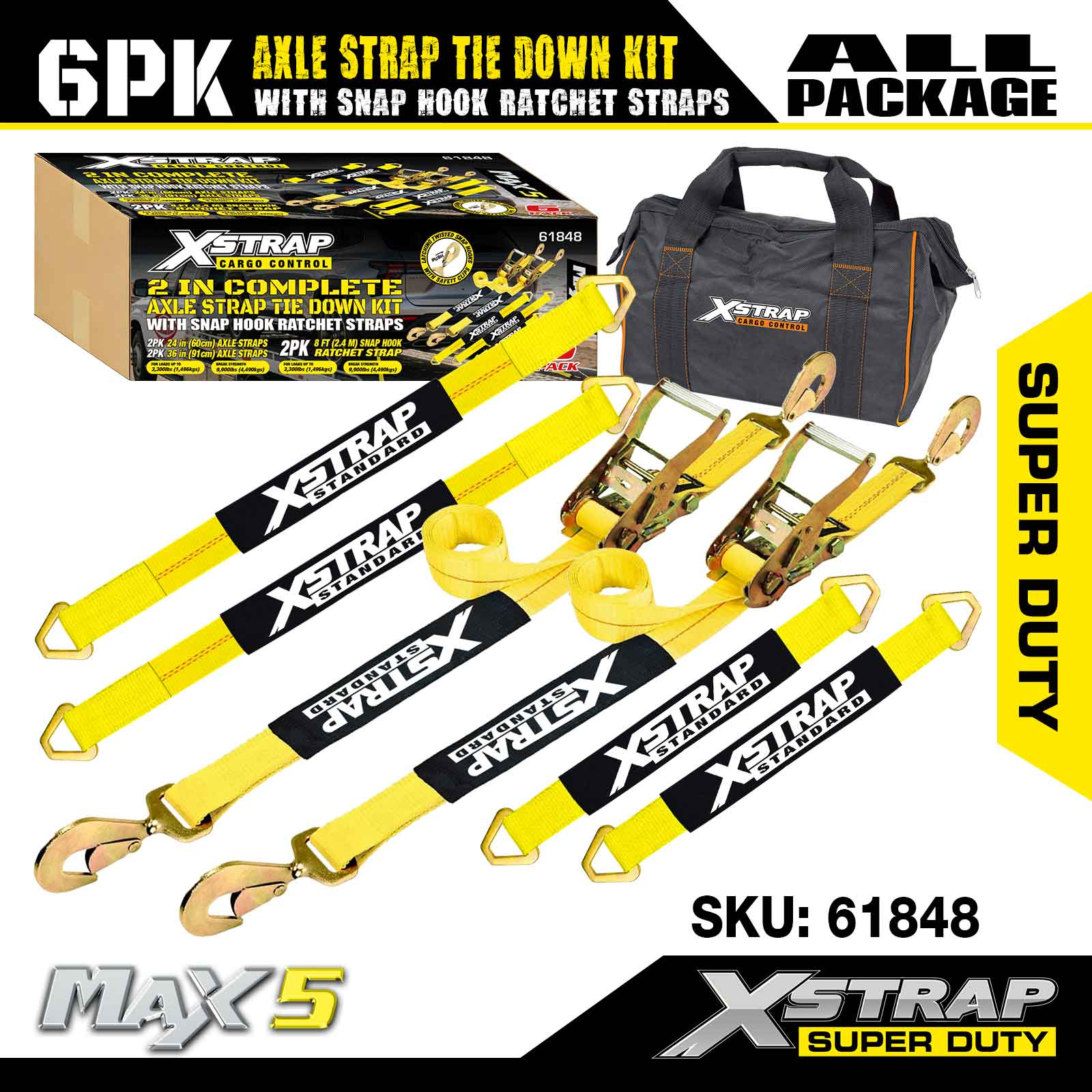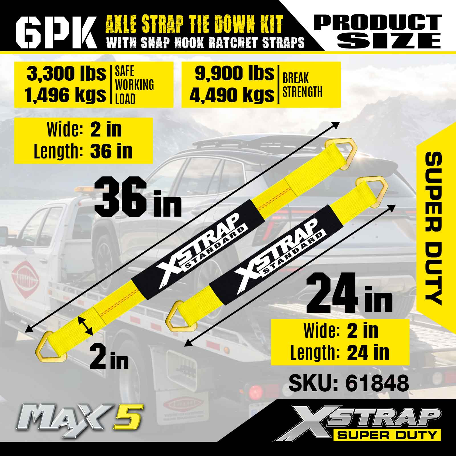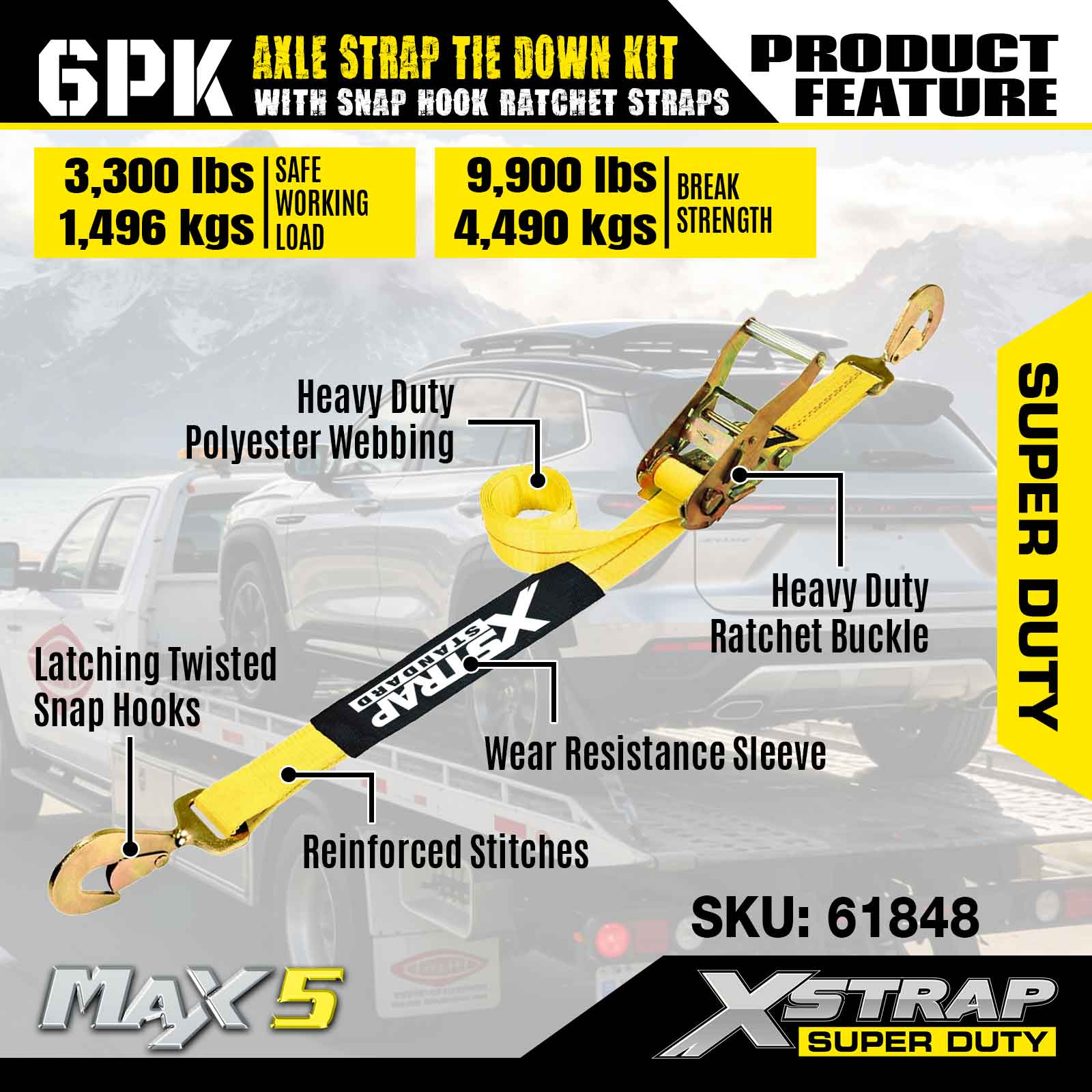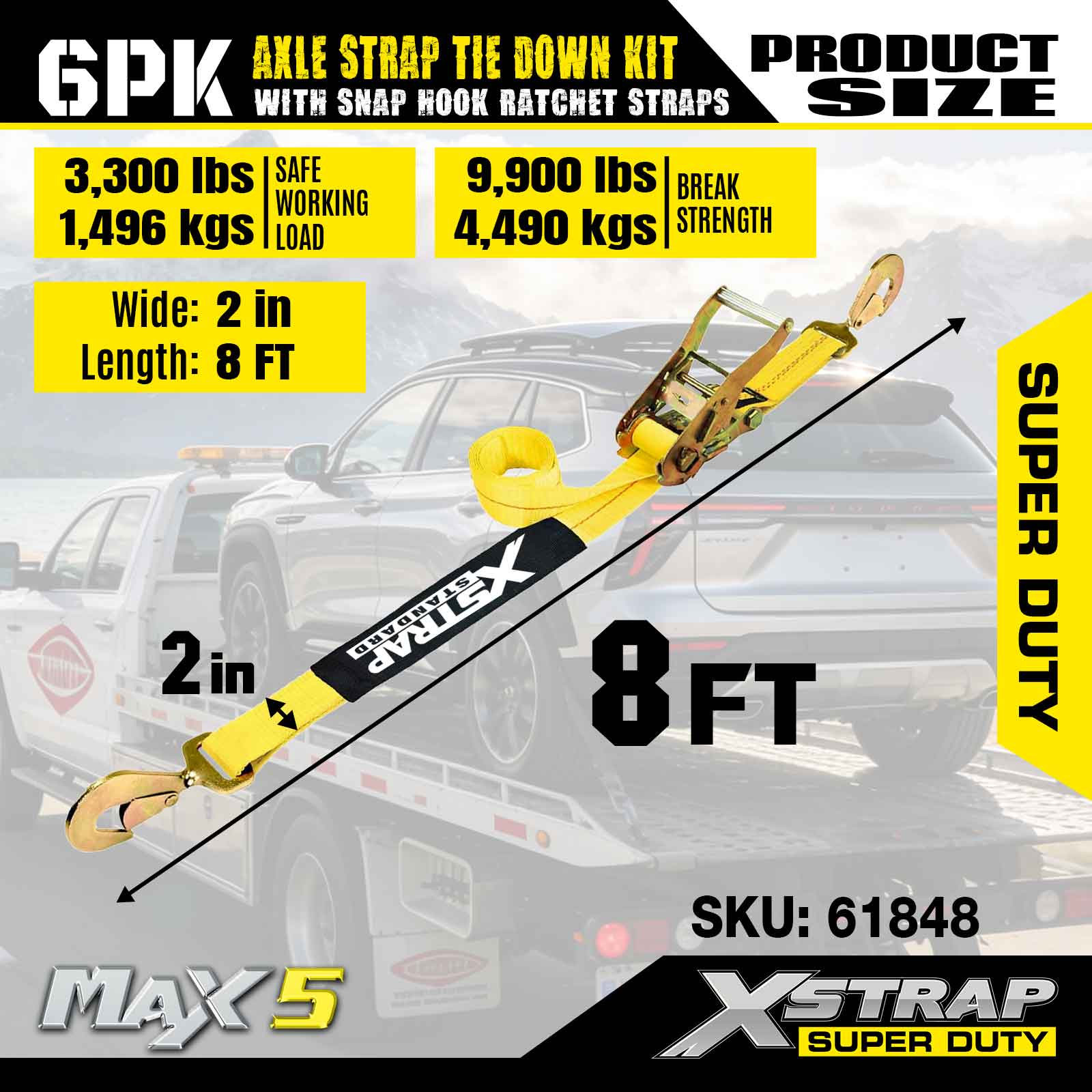 Xstrap 6PK Achsgurt-Zurrgurt-Set (mit Karabinerhaken-Ratschengurten) – Super Duty. Es hat eine sichere Arbeitslast von 3.300 Pfund (1.496 kg) und eine Bruchfestigkeit von 9.900 Pfund (4.490 kg).
