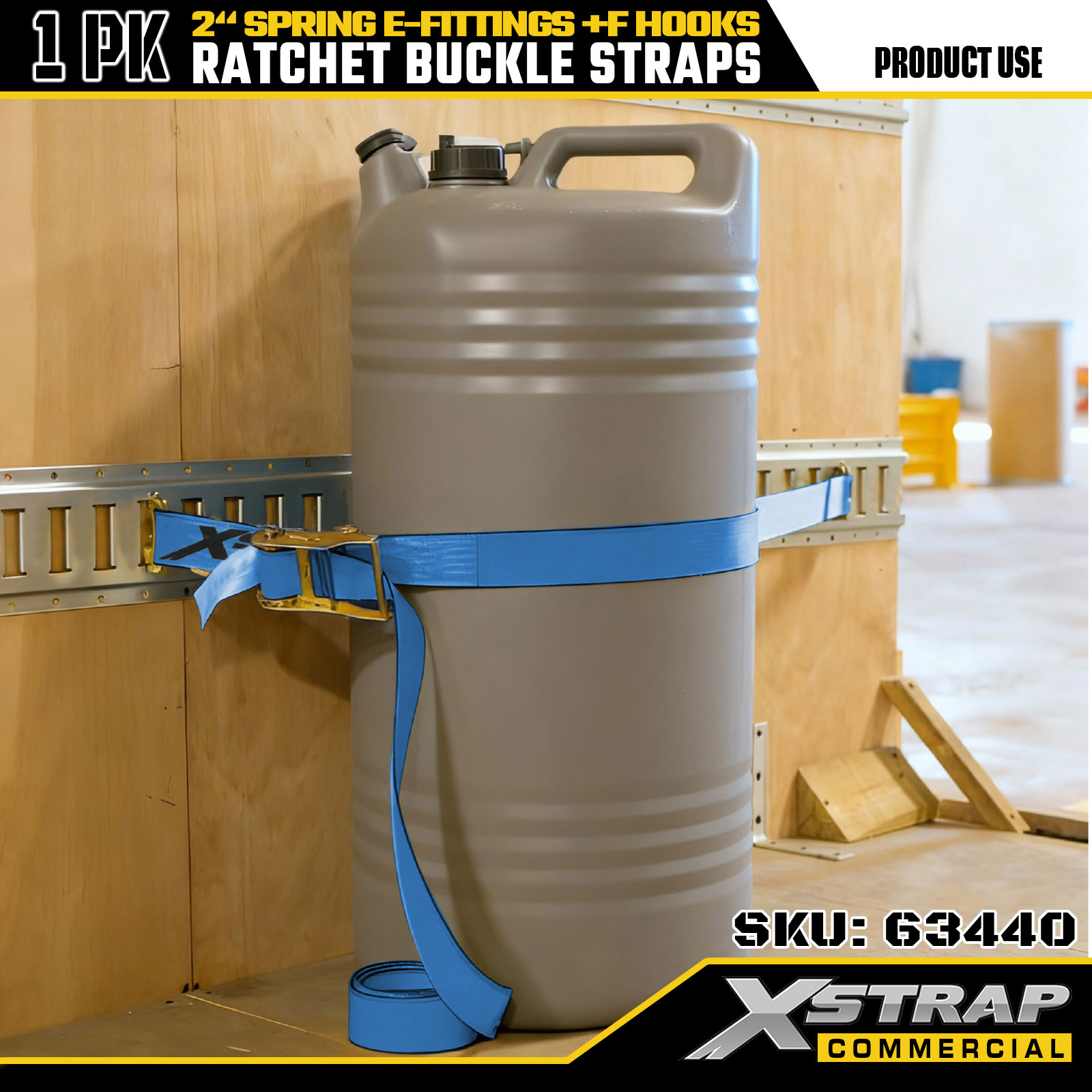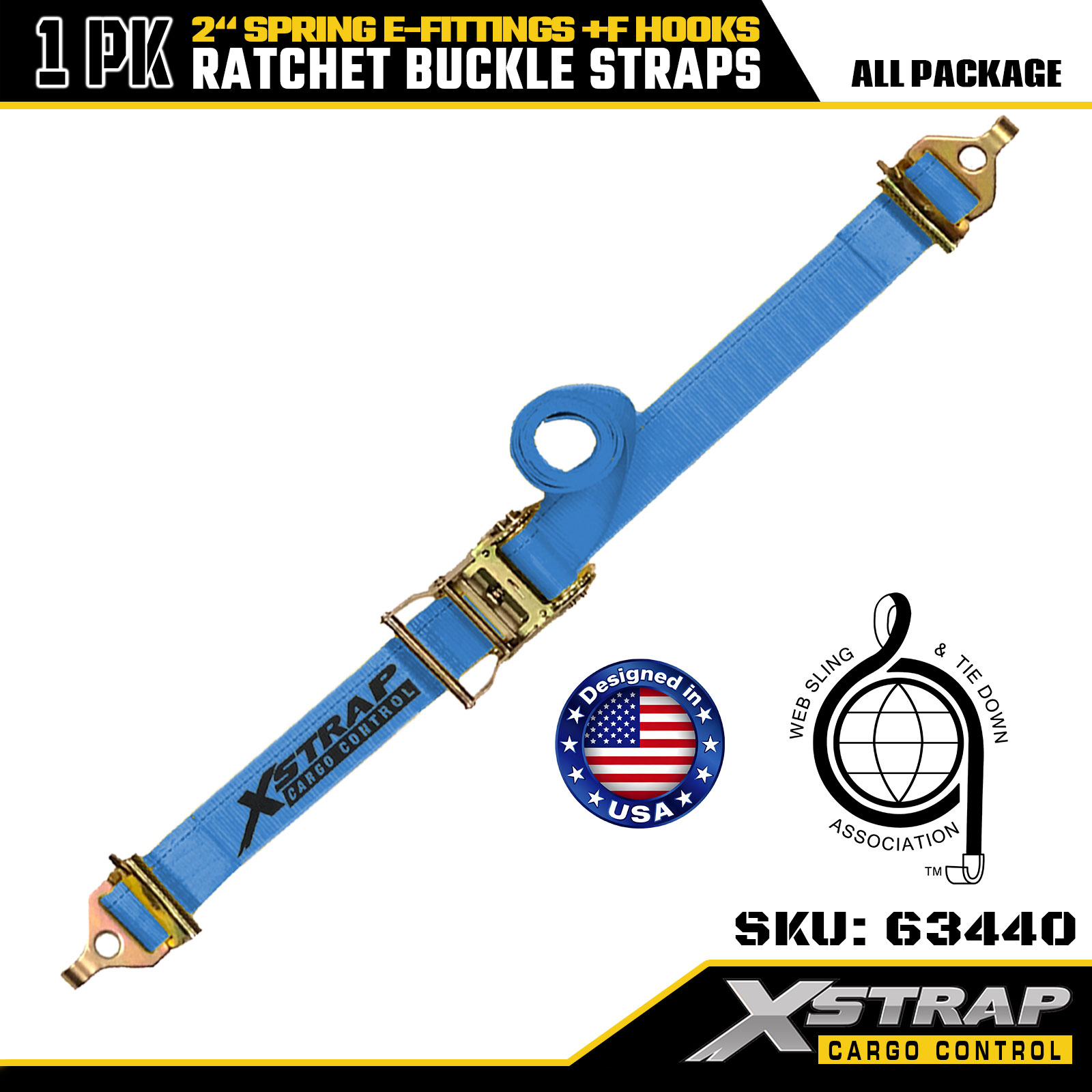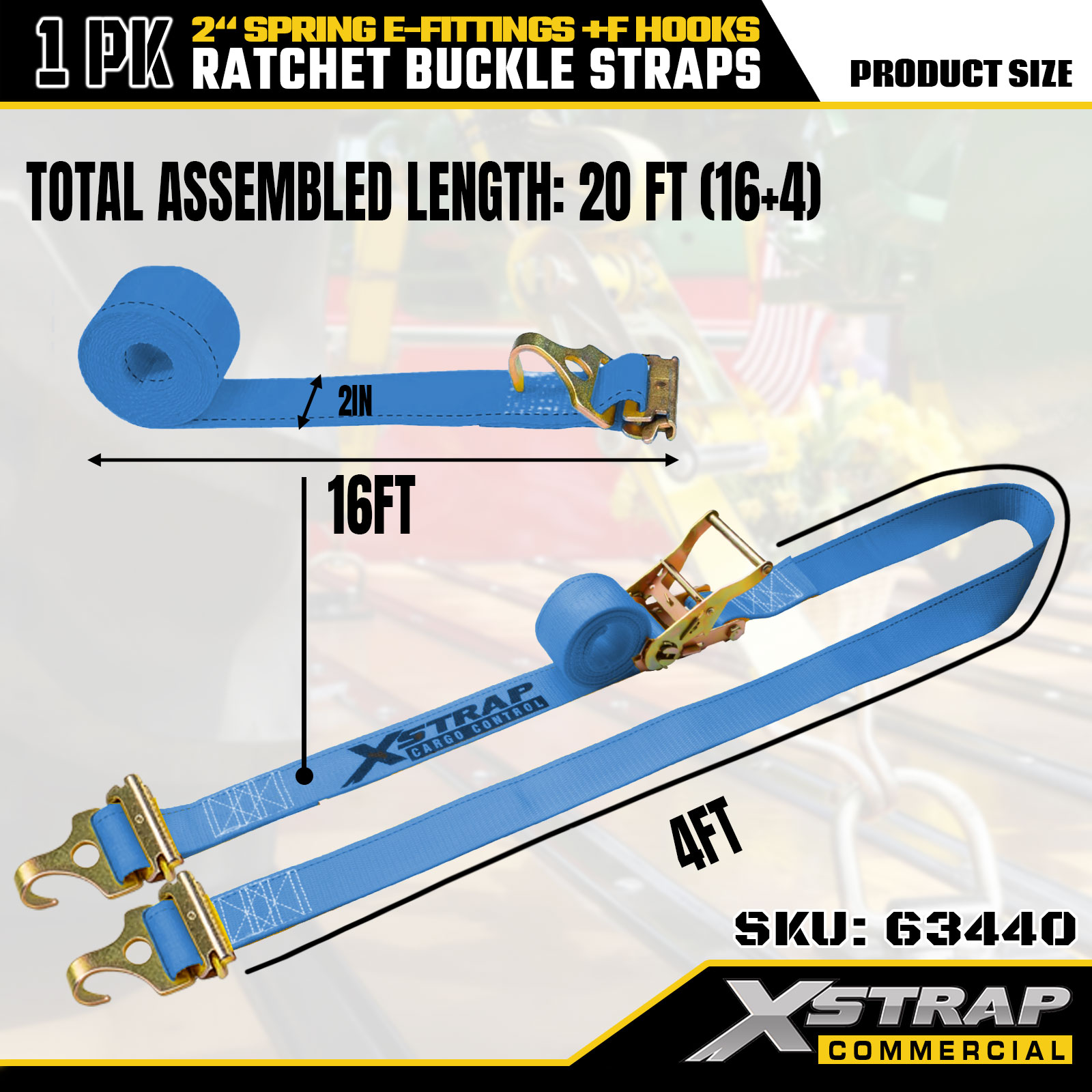 Xstrap 63440 Hochleistungs-Ratschengurt 2" x 20' (1 Stück) – blaues Gurtband, Feder-E-Anschlüsse und F-Haken, 733 lbs SWL für Umzug, Gütertransport und LKW-Einsatz