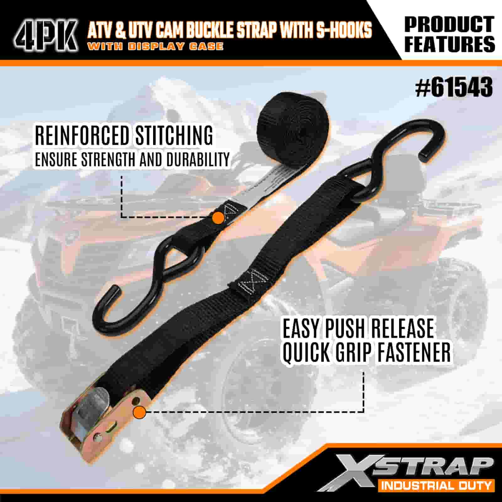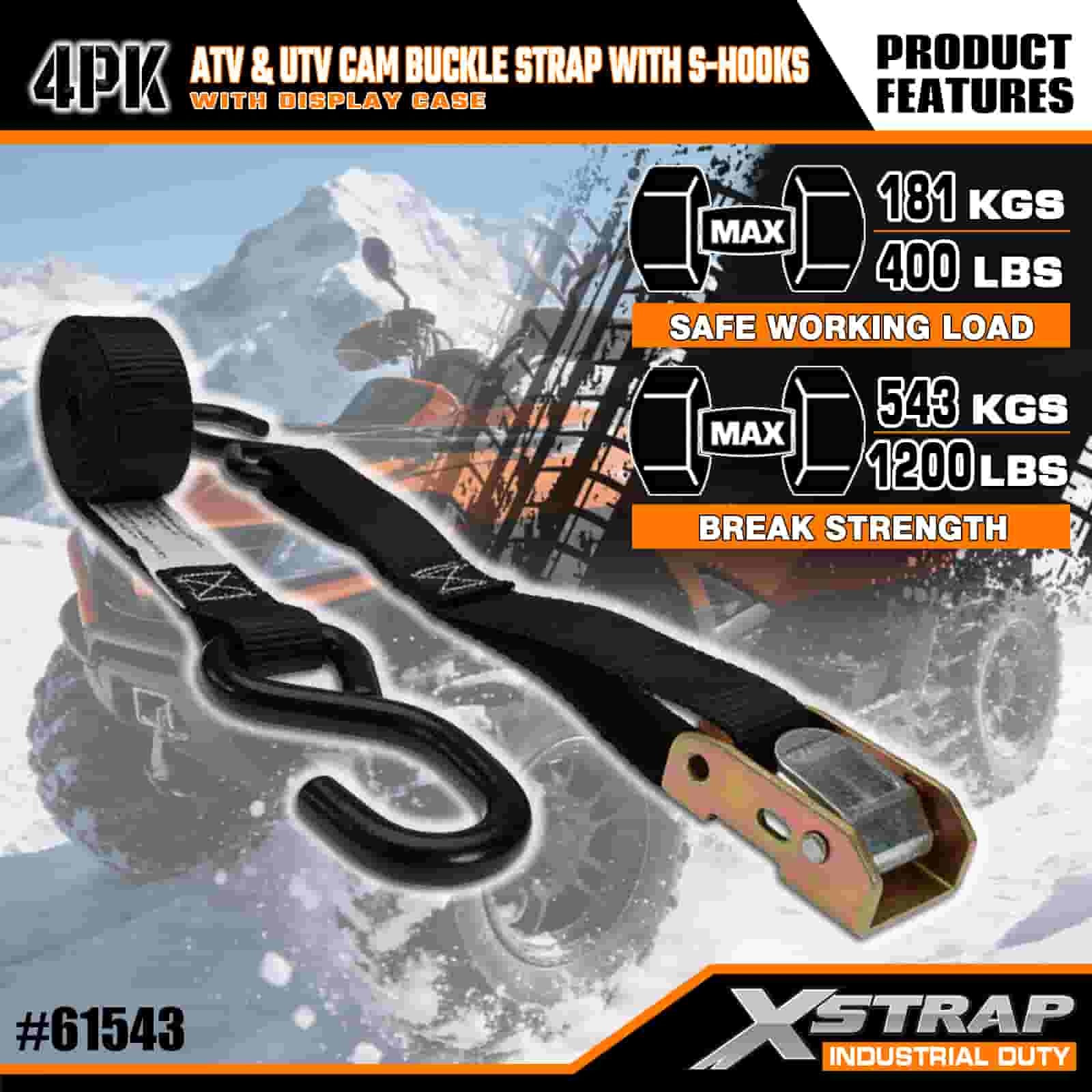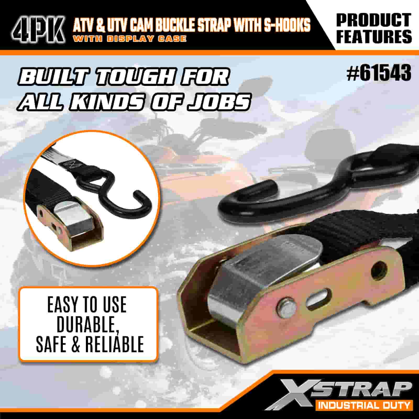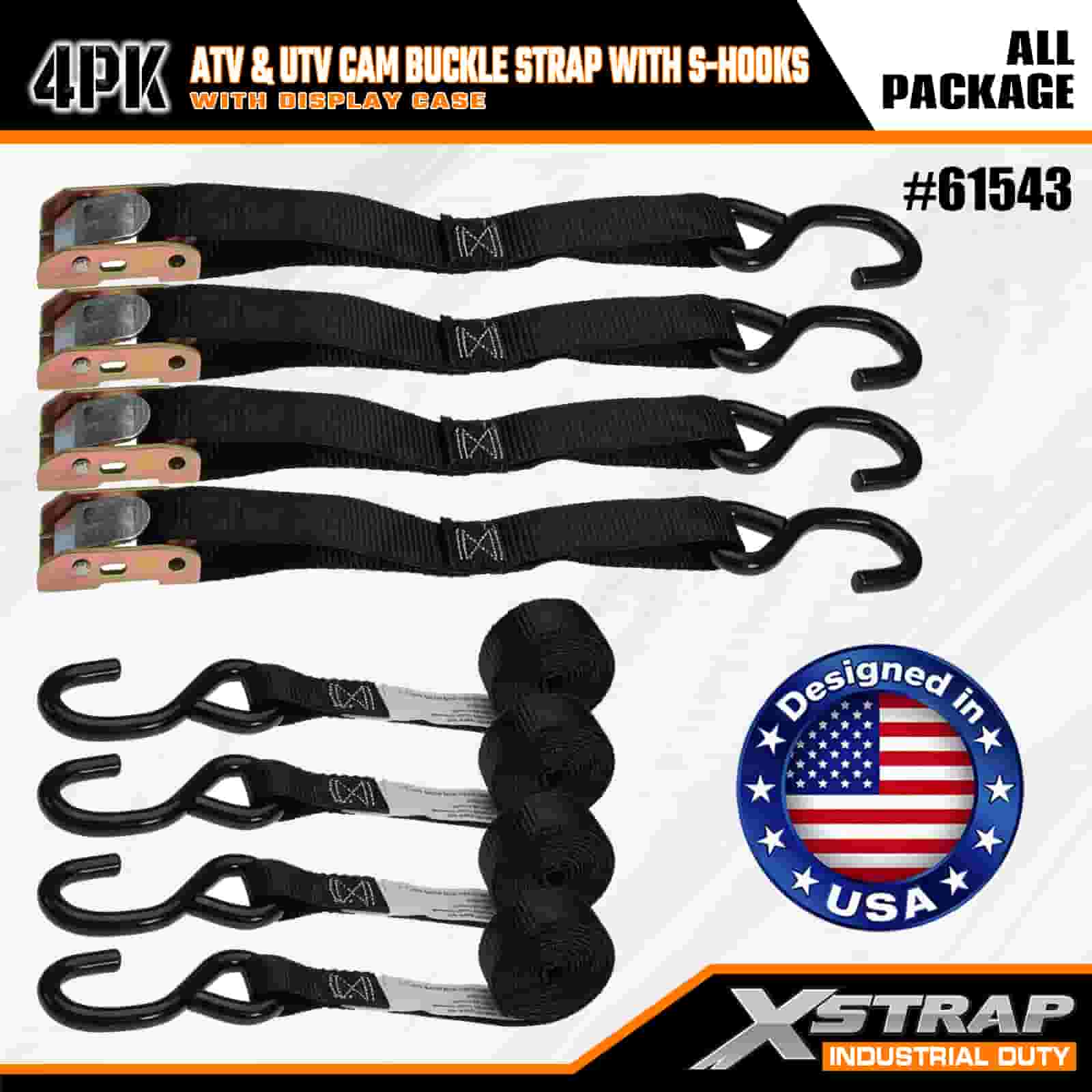 Xstrap 4 Stück ATV- und AUV-Cam-Schnallengurt mit S-Haken, 2,5 cm x 1,8 m Polyester-Zurrgurt mit Ratschenschnalle, 400 lbs Kapazität, Zurrgurte mit S-Haken für den Profi zur Sicherung von Lastenanhängern, Tiefladern, Skibooten und Kleinwagen.