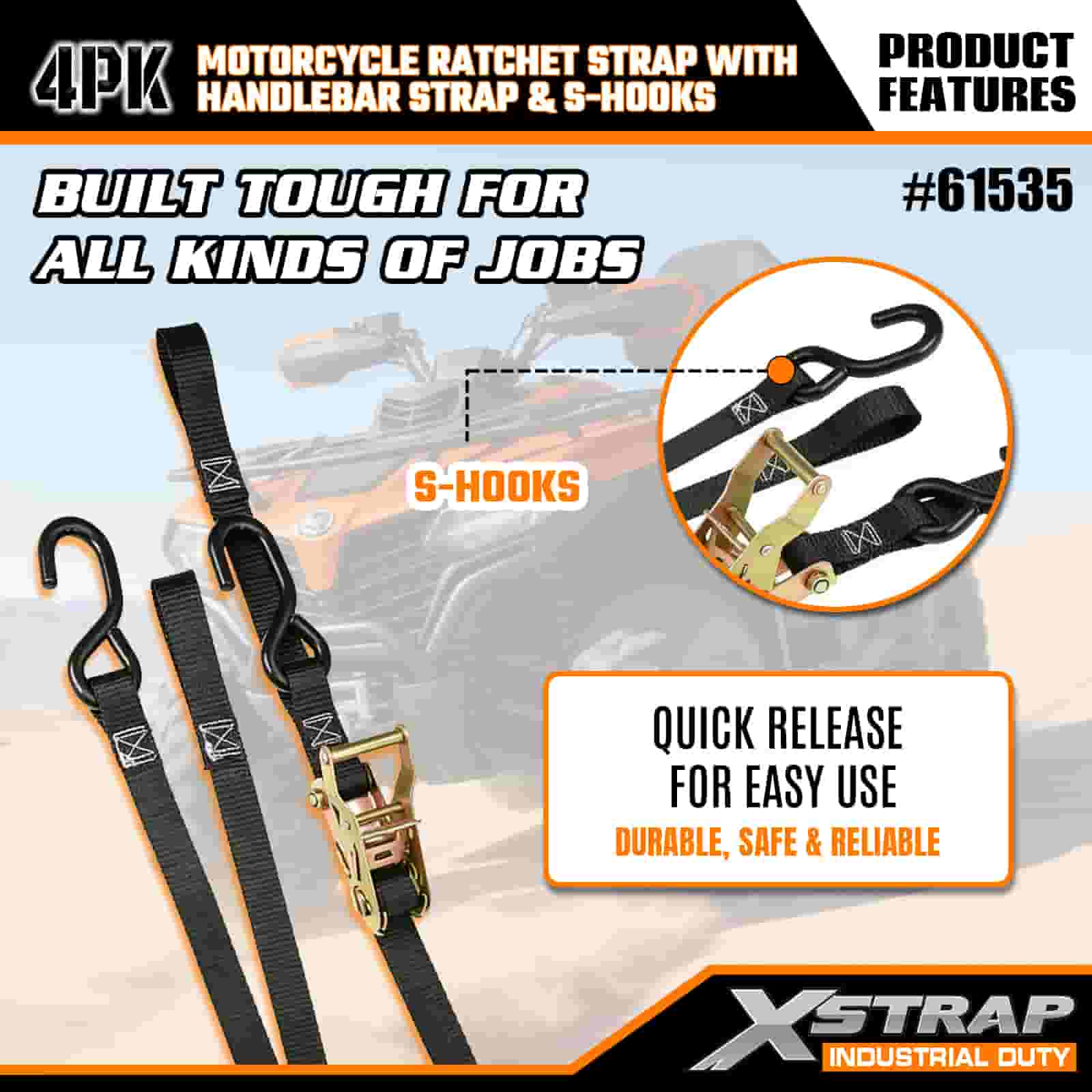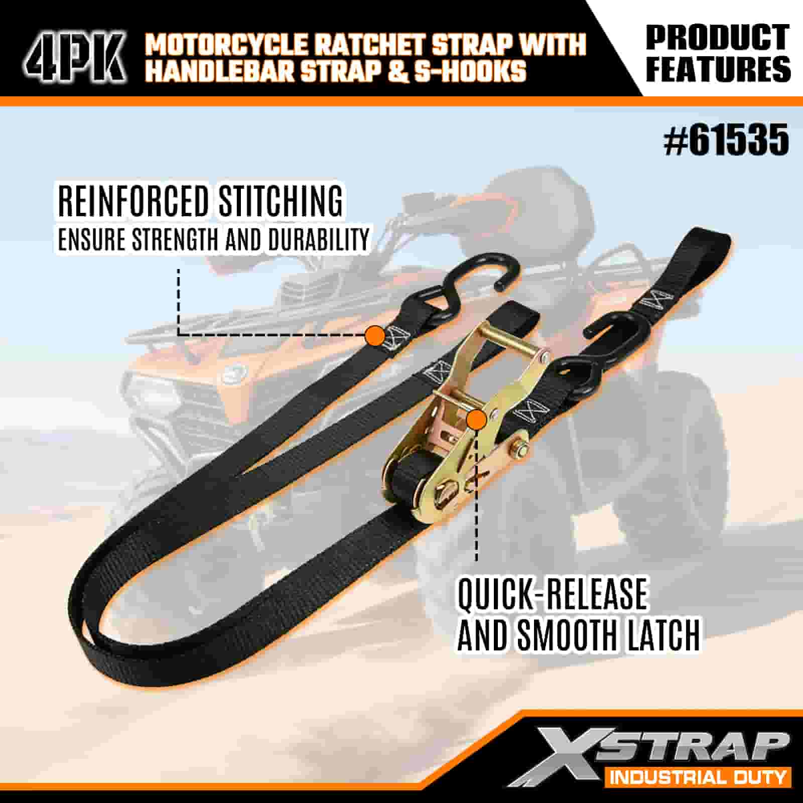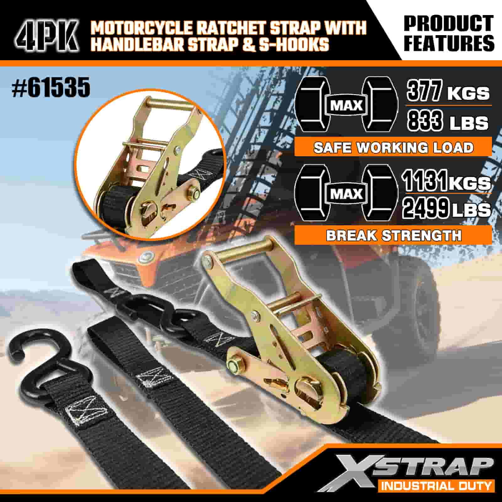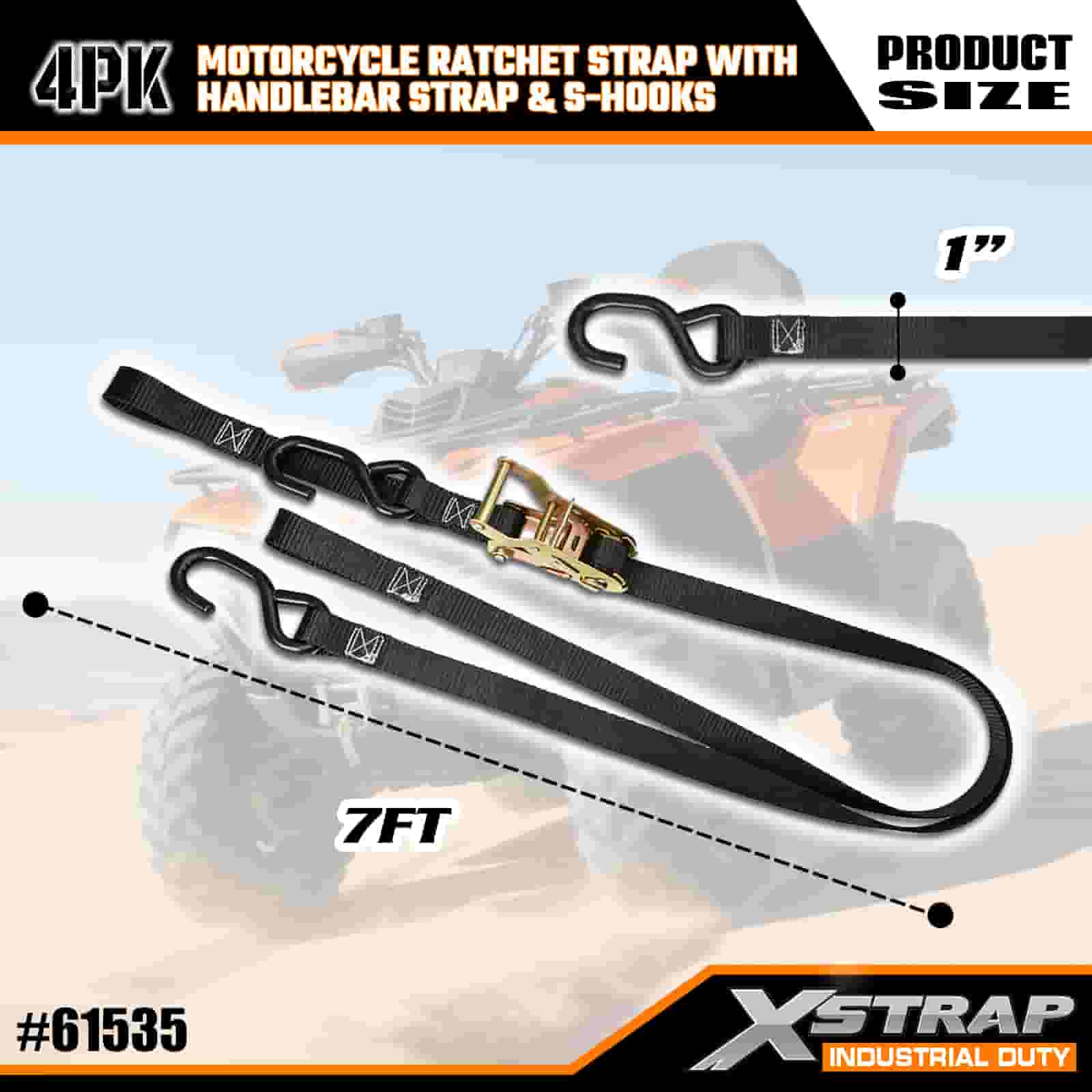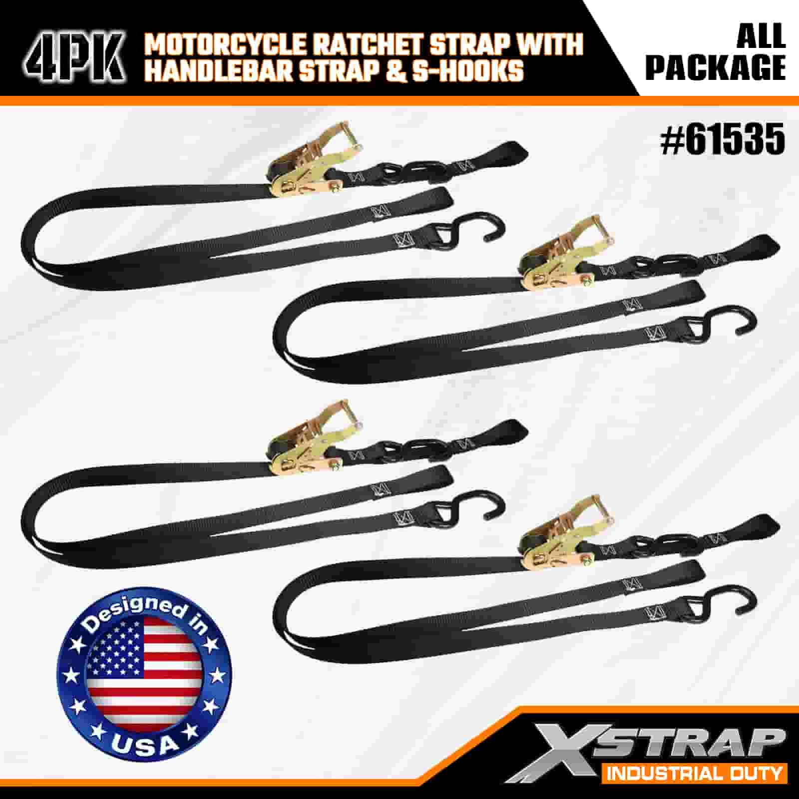 Xstrap 4 Stück Motorrad-Ratschengurt mit Lenkergurt und S-Haken, 2,5 cm x 2,1 m Polyester-Zurrgurt, Ratschengurt, 833 lbs Kapazität, Zurrgurte mit S-Haken für Profis zur Sicherung von Frachtanhängern, Tiefladern, Skibooten und Kleinwagen.