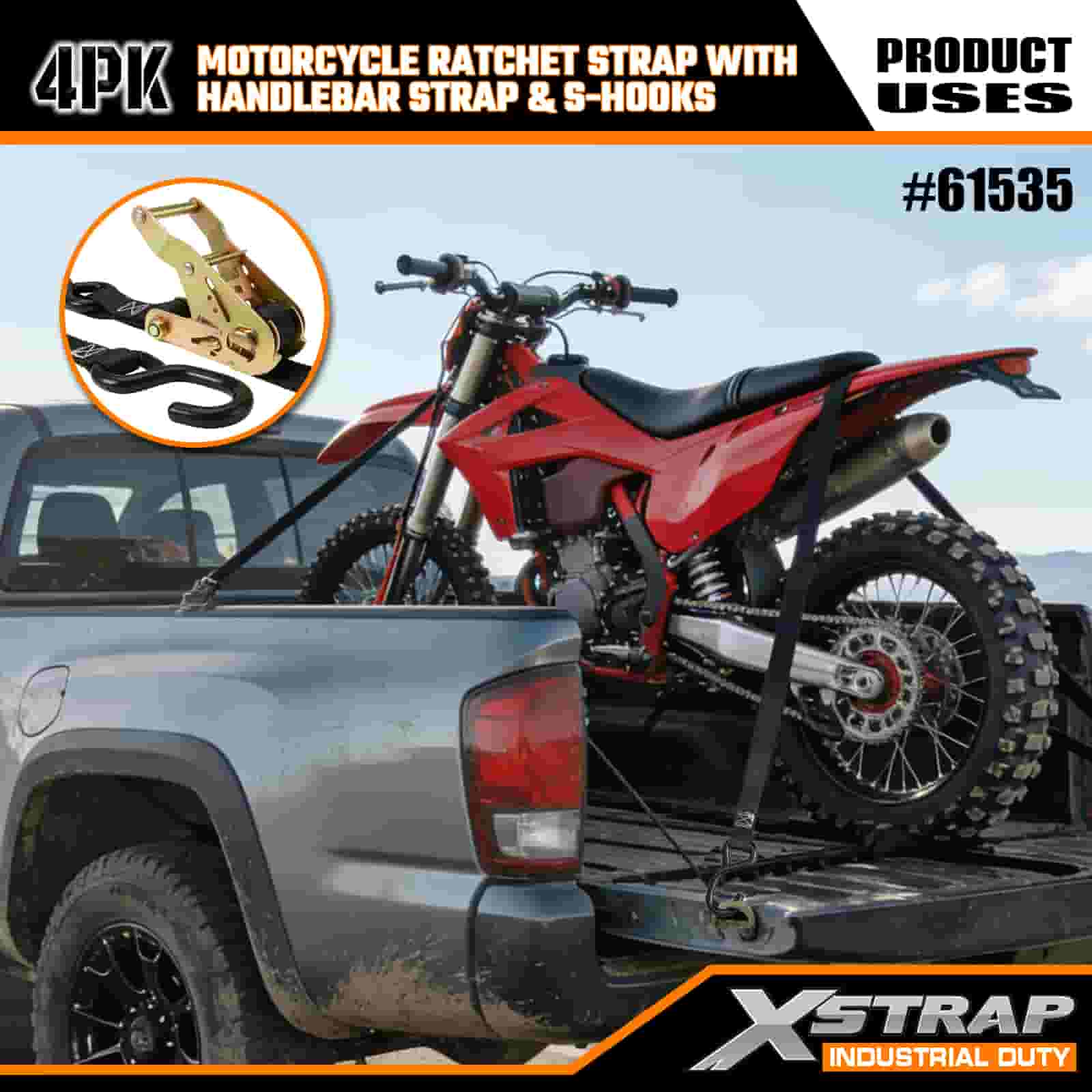- 4er-Pack 7-Fuß-Gurte für den Motorradgebrauch: Verkauft als 4-Gurt-Set (1 Zoll breit × 7 Fuß lang), ideal zum Sichern von Motorrädern, Lenkern und kleiner Ausrüstung auf LKW-Ladeflächen oder beim Transport.