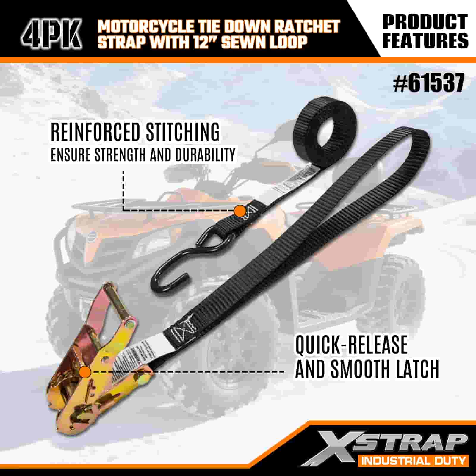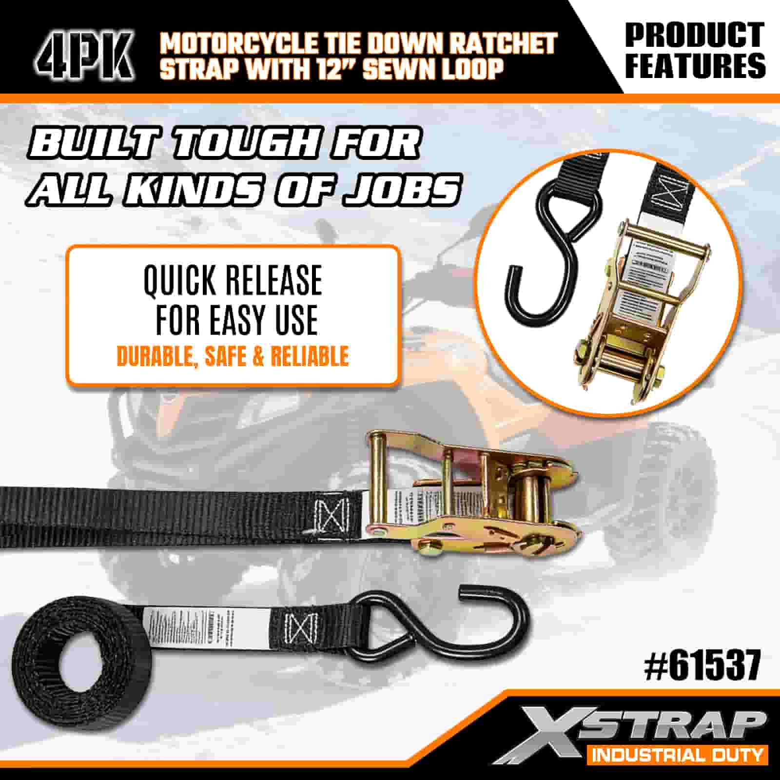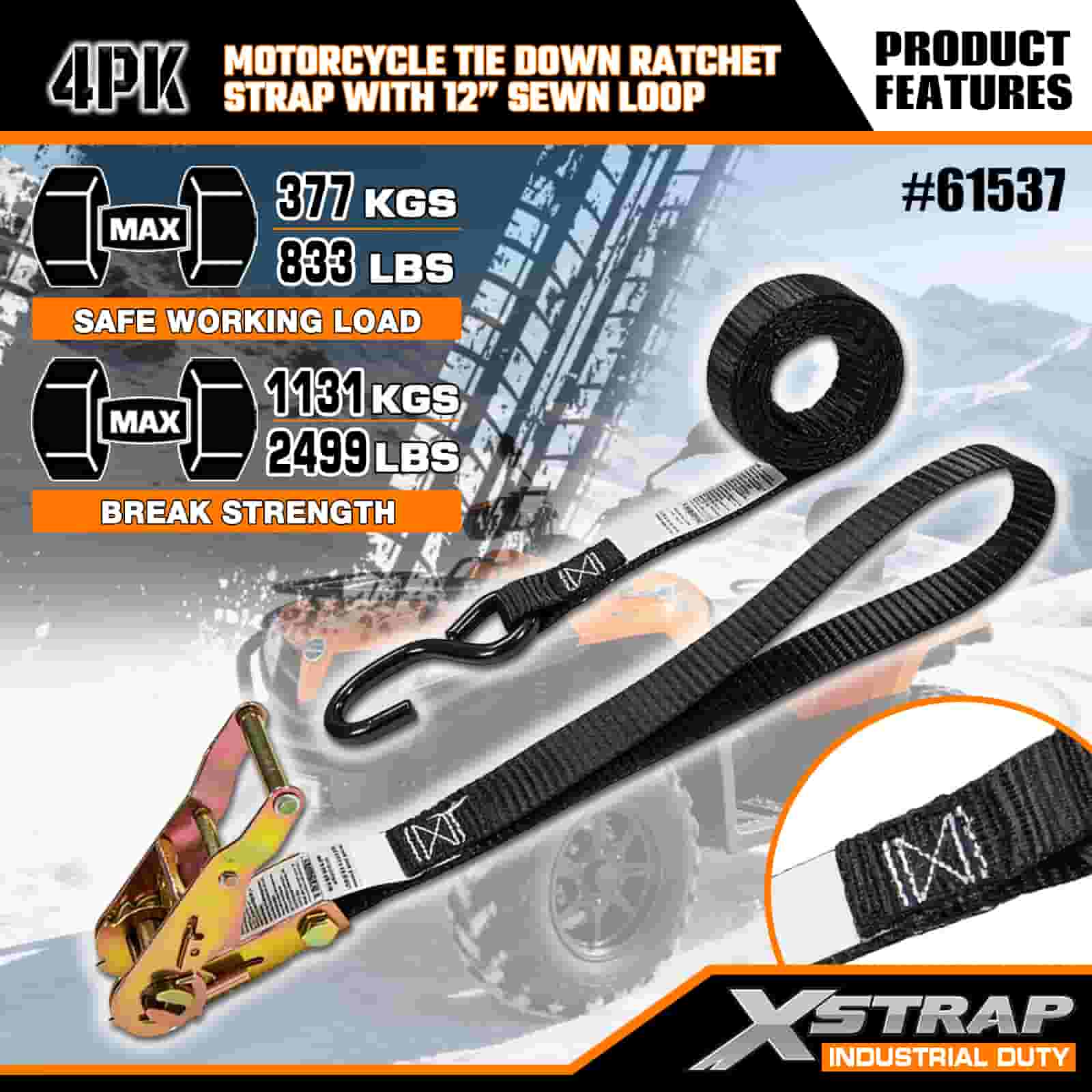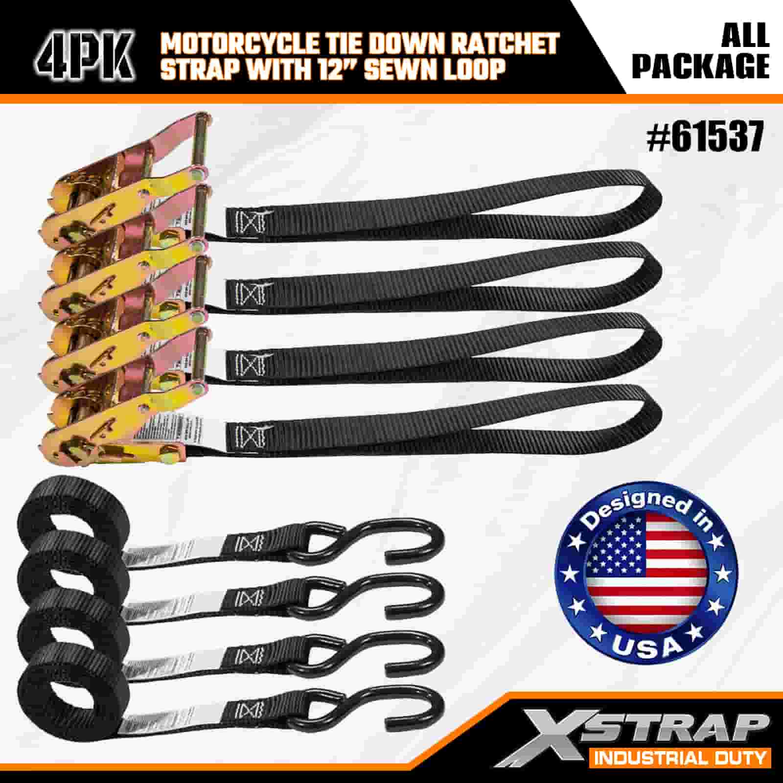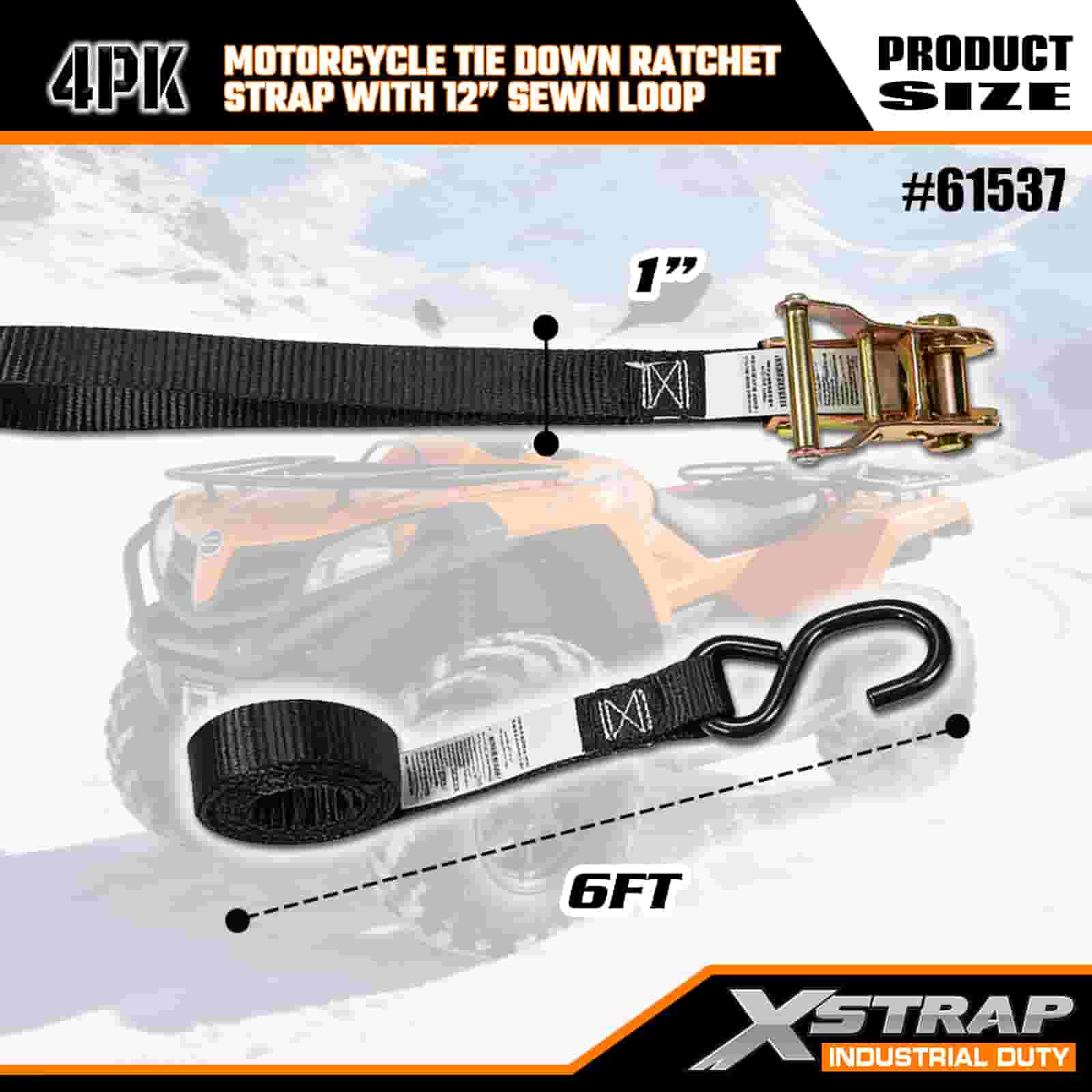 Xstrap 4er-Pack Ratschengurt für Motorräder mit genähter 12-Zoll-Schlaufe, 1" x 6 Fuß großer Spanngurt aus Polyester mit Ratschengurt, 833 Pfund Kapazität, Zurrgurte zur Ladungssicherung mit S-Haken für Profis zur Sicherung von Lastenanhängern, Tiefladern, Skibooten und Kleinwagen.