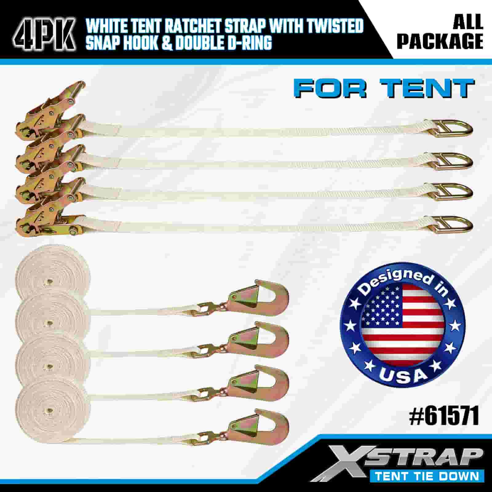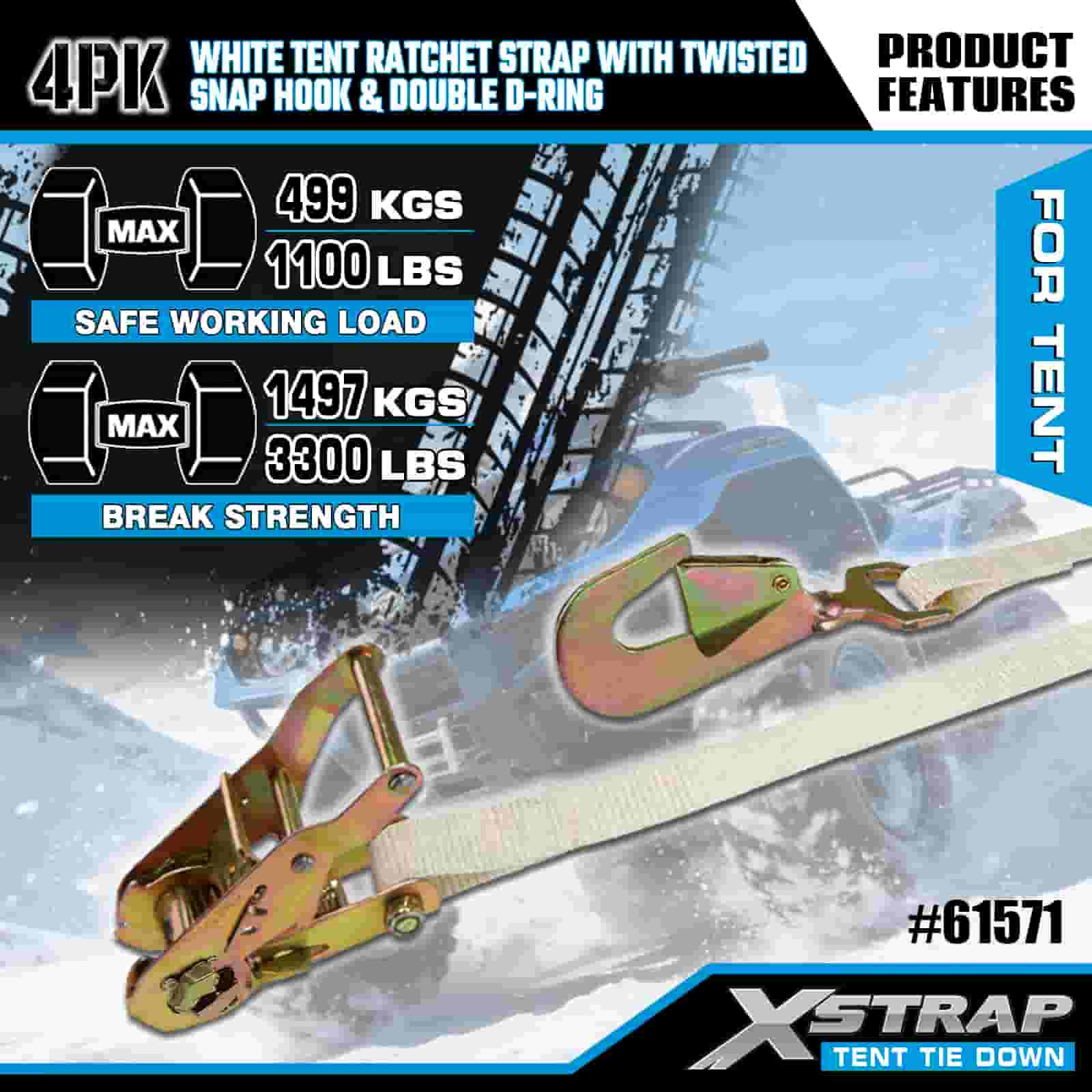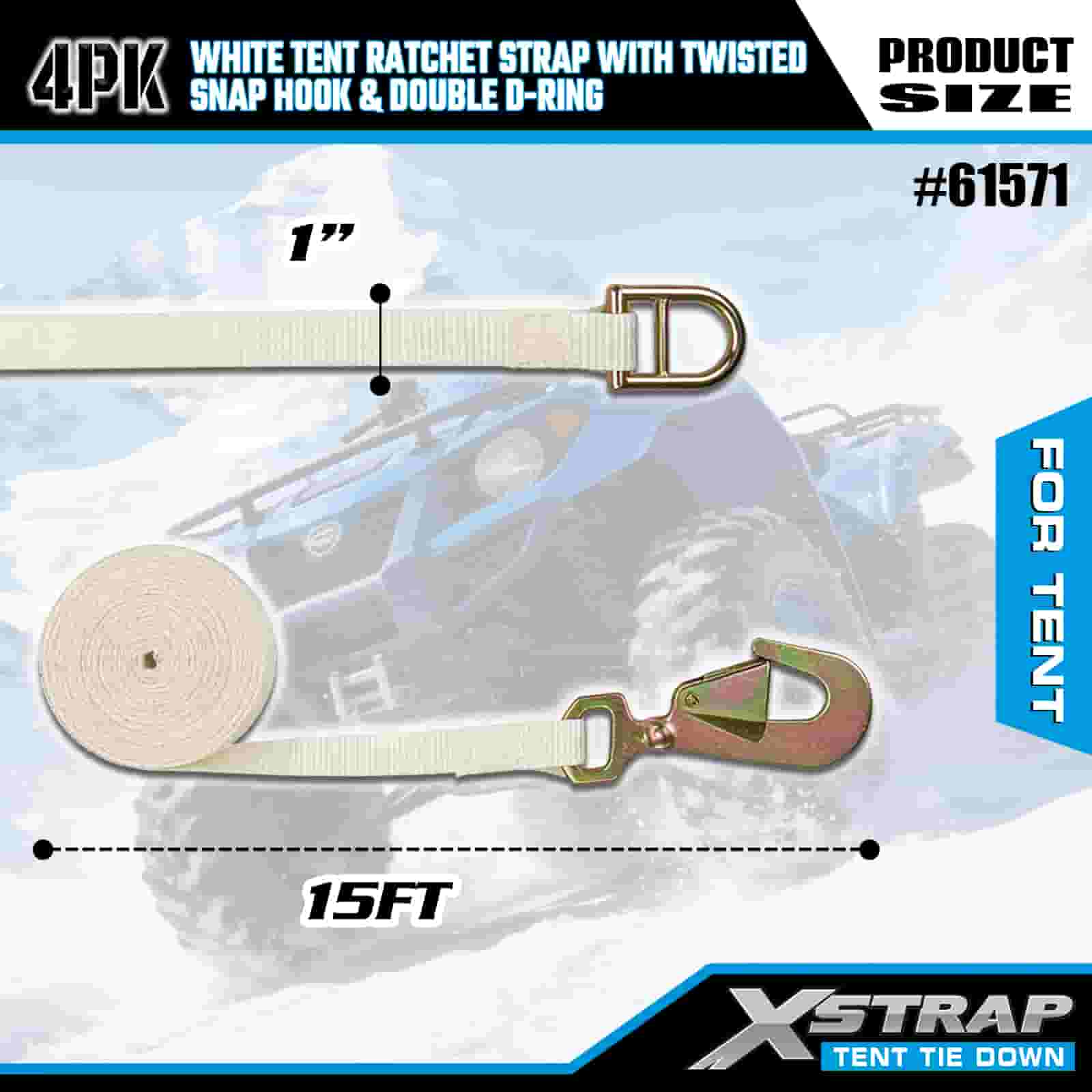 Xstrap 4 Stück weiße Ratschengurte für Zelte mit gedrehtem Karabinerhaken und Doppel-D-Ring, 1 Zoll x 15 Zoll Ratschengurt aus Polyester, 1100 Pfund Kapazität, Zurrgurte zur Ladungssicherung mit gedrehtem Karabinerhaken und Doppel-D-Ring zur Ladungskontrolle und Zeltfixierung.