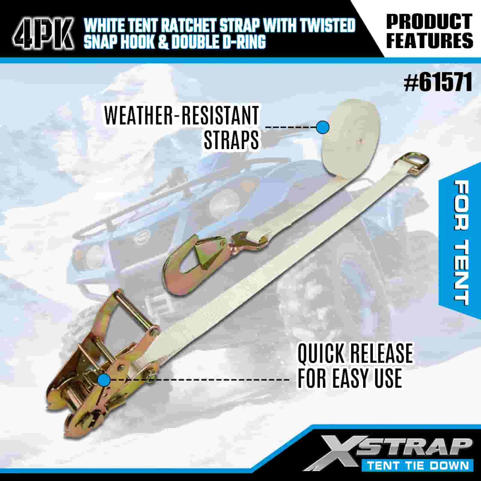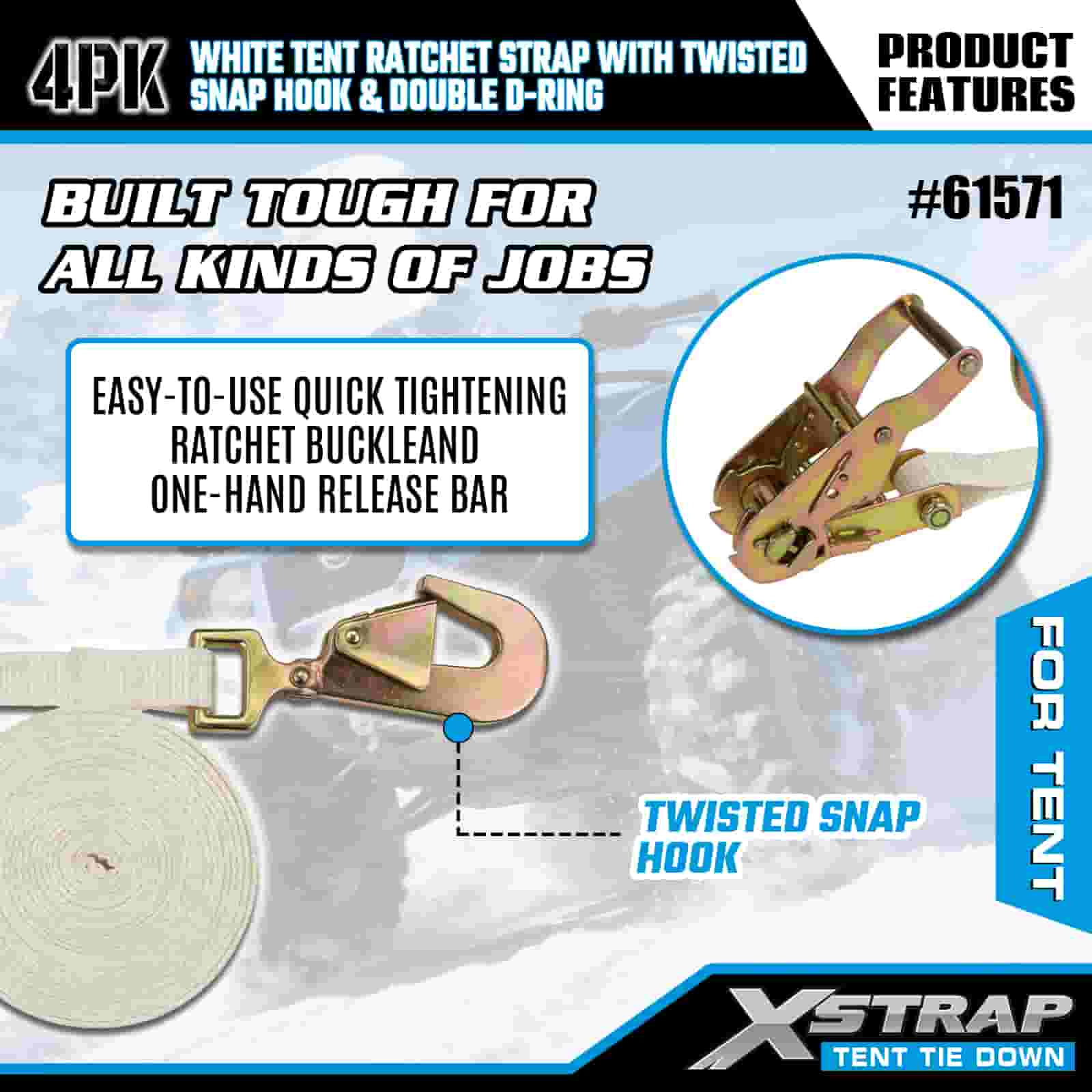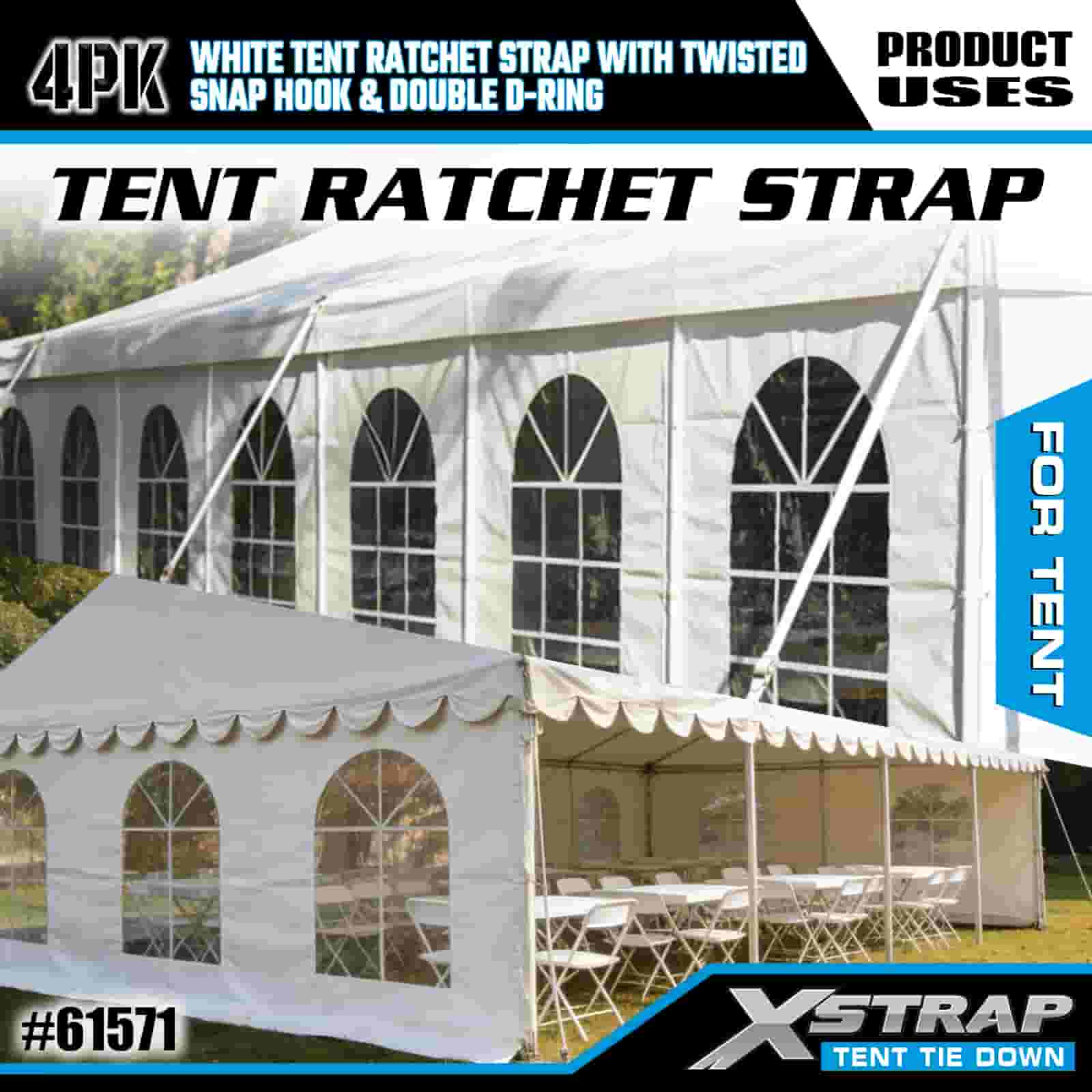 Xstrap 4 Stück weiße Ratschengurte für Zelte mit gedrehtem Karabinerhaken und Doppel-D-Ring, 1 Zoll x 15 Zoll Ratschengurt aus Polyester, 1100 Pfund Kapazität, Zurrgurte zur Ladungssicherung mit gedrehtem Karabinerhaken und Doppel-D-Ring zur Ladungskontrolle und Zeltfixierung.