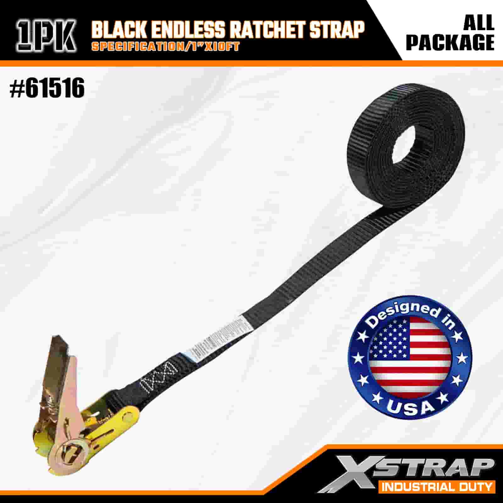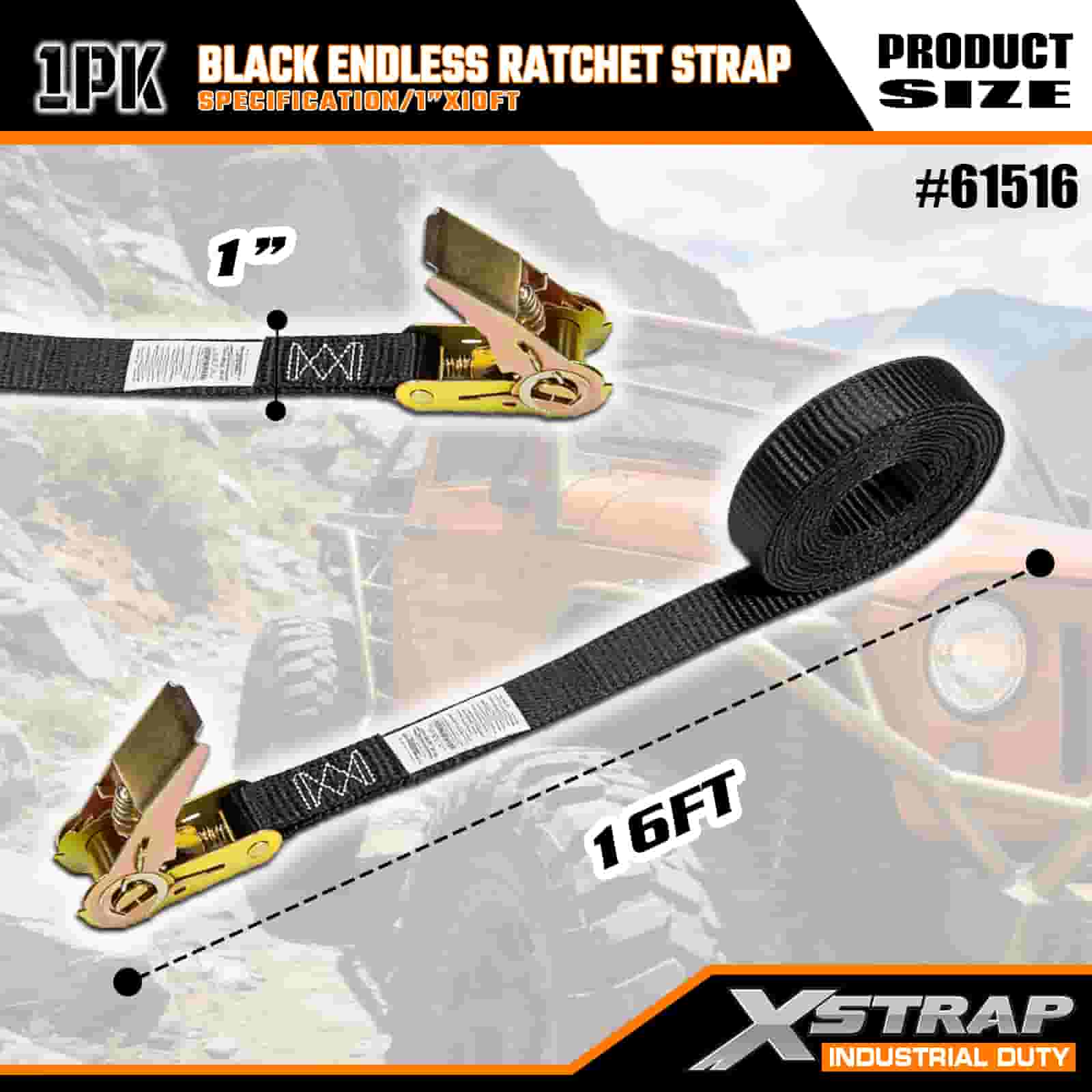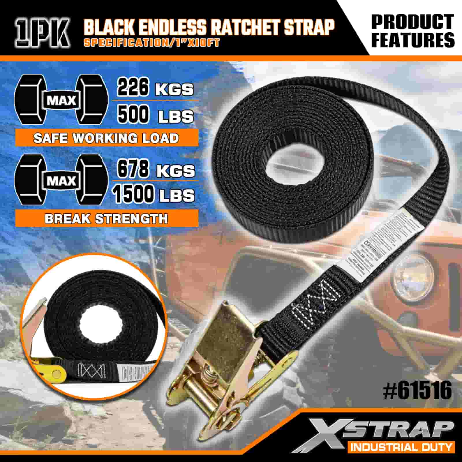 Schwarzer endloser Ratschengurt von Xstrap, 2,5 cm x 3 m, Spanngurt aus Polyester, Zugratschengurt, 500 Pfund Kapazität, Zurrgurte zur Ladungssicherung für den seriösen Profi zur Sicherung von Frachtanhängern, Tiefladern, Skibooten und Kleinwagen.