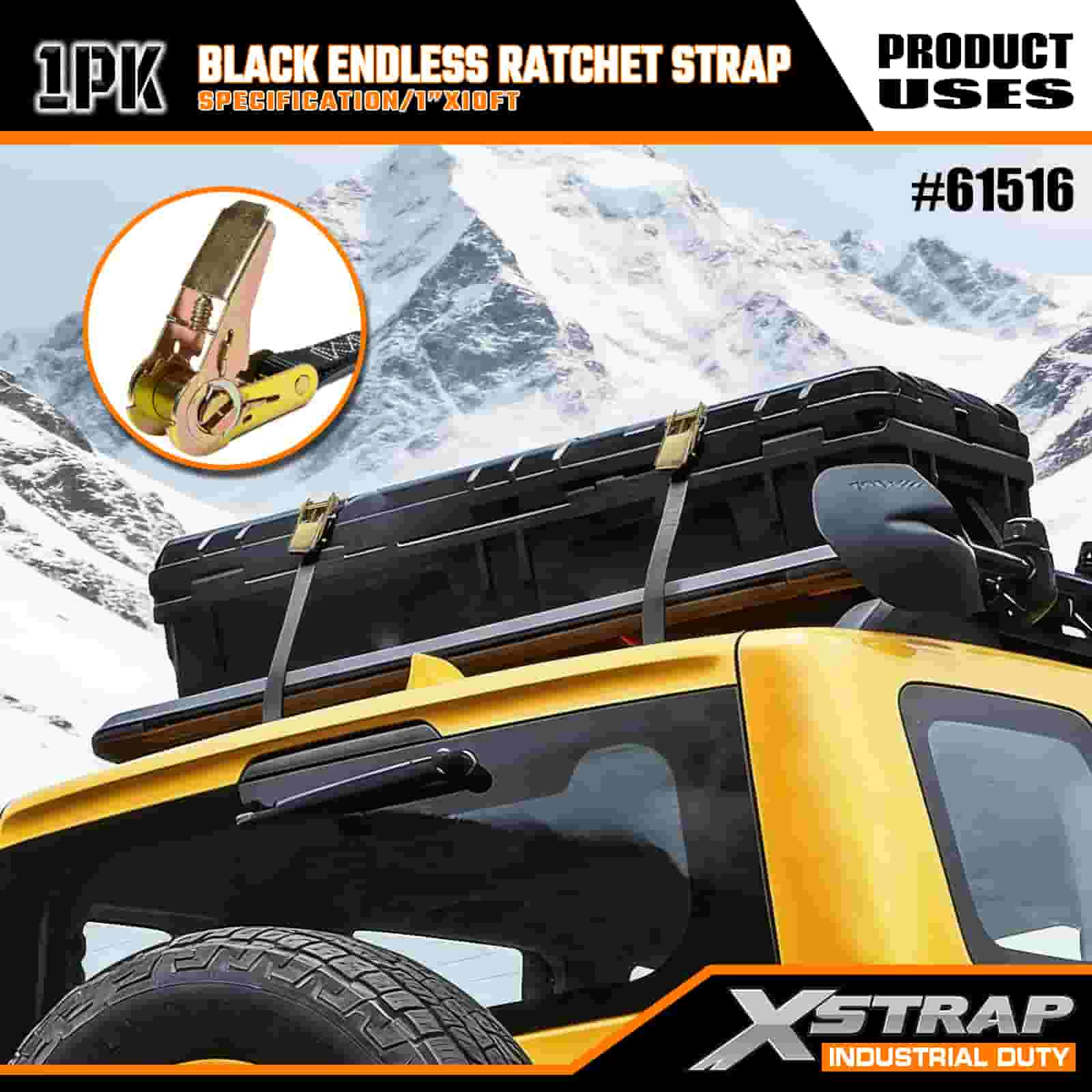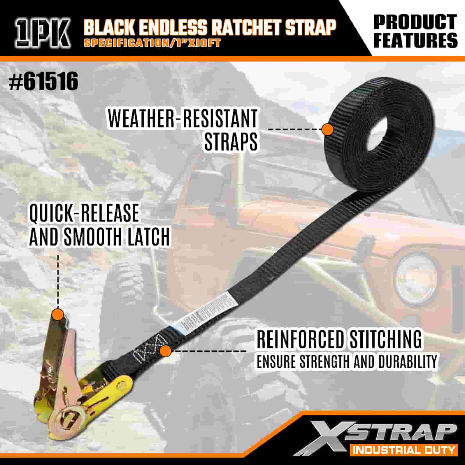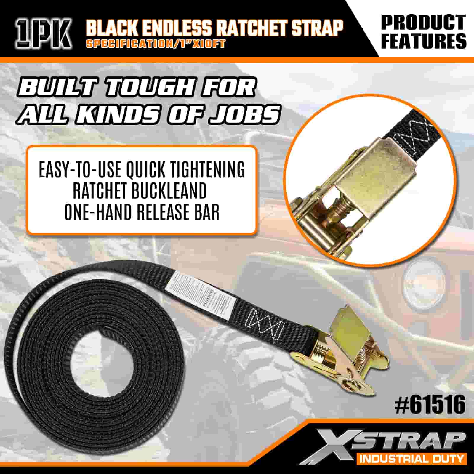 Schwarzer endloser Ratschengurt von Xstrap, 2,5 cm x 3 m, Spanngurt aus Polyester, Zugratschengurt, 500 Pfund Kapazität, Zurrgurte zur Ladungssicherung für den seriösen Profi zur Sicherung von Frachtanhängern, Tiefladern, Skibooten und Kleinwagen.