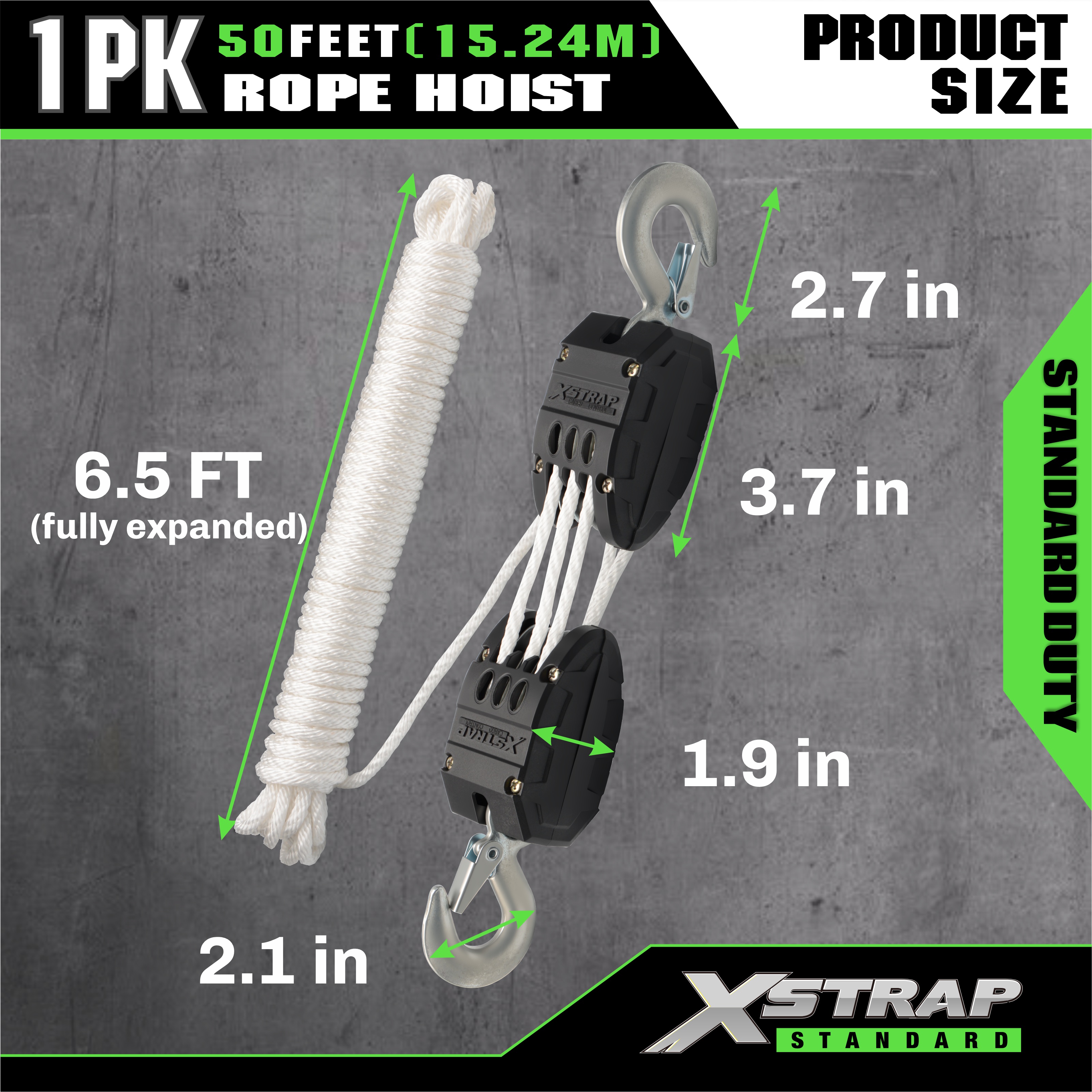 Dies ist das Xstrap Standard-Seilzug-Rollensystem. Die Kapazität beträgt 1000 Pfund, die Bruchfestigkeit beträgt 2000 Pfund. 5:1 Hubkraft, 50 Fuß, robuster Flaschenzug für die Jagd, Heben schwerer Gegenstände mit rutschfesten Arbeitshandschuhen, 2 Stück weiche Schlaufen.