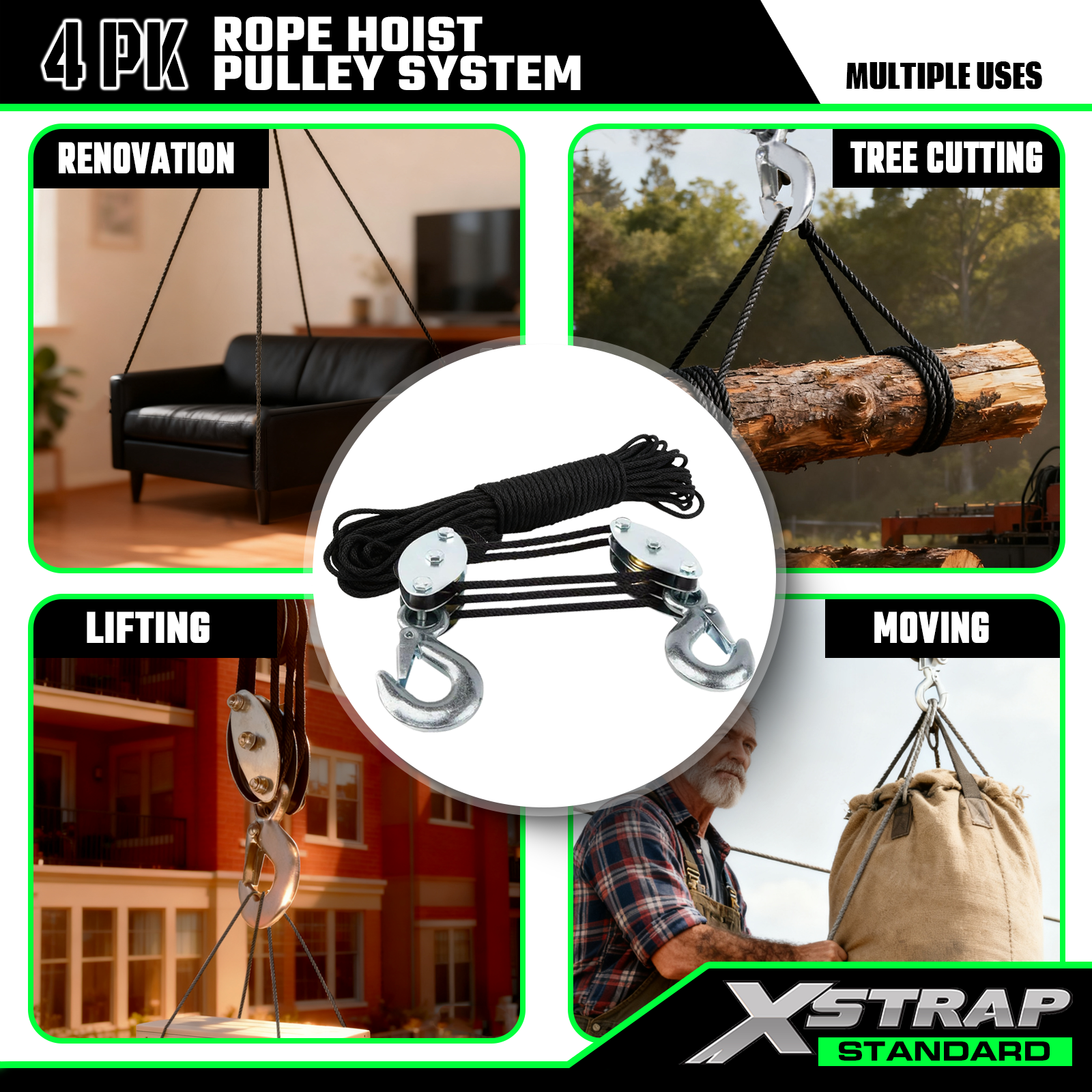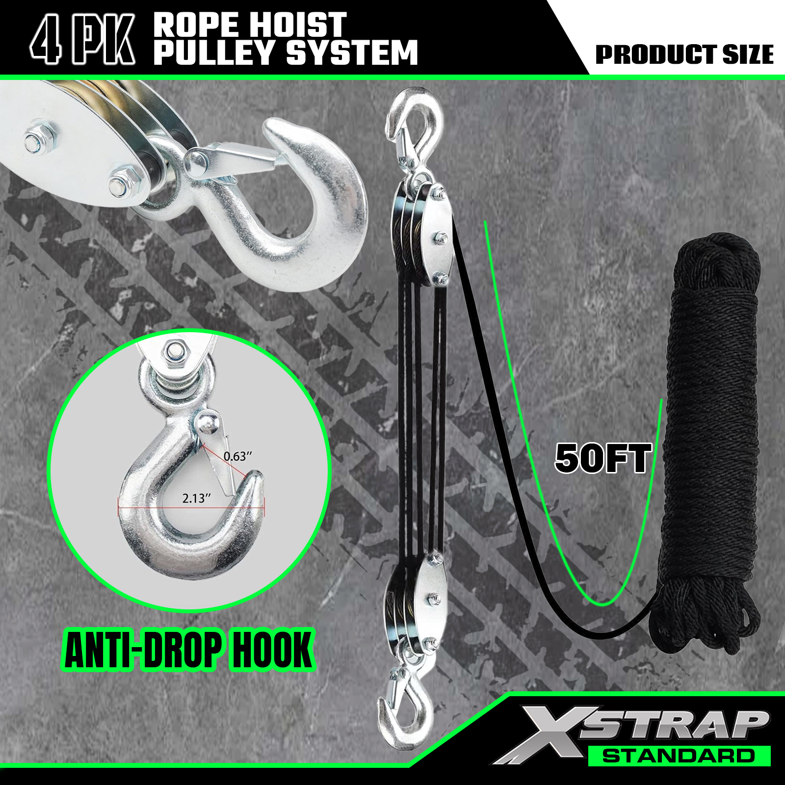 Dies ist das Xstrap Standard-Seilzug-Rollensystem. Die Kapazität beträgt 1000 Pfund, die Bruchfestigkeit beträgt 2000 Pfund. 5:1 Hubkraft, 50 Fuß, robuster Flaschenzug für die Jagd, Heben schwerer Gegenstände mit rutschfesten Arbeitshandschuhen, 2 Stück weiche Schlaufen.