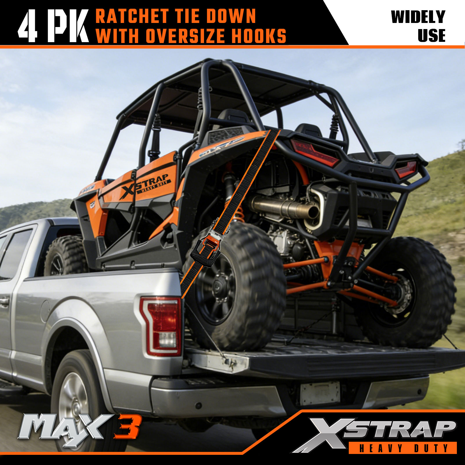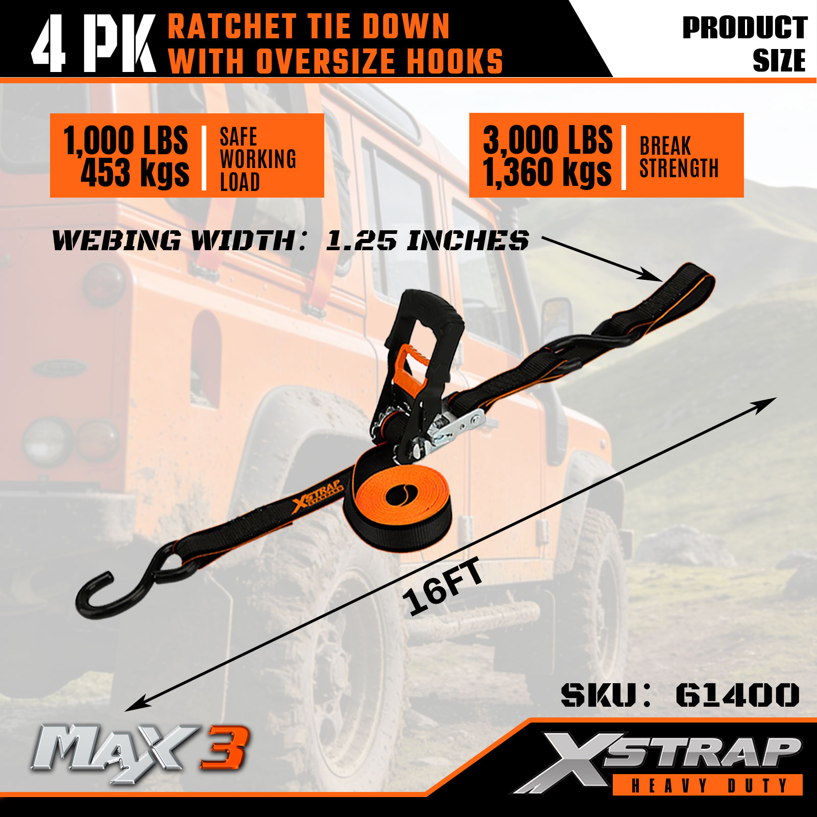 Xstrap 4er-Pack Ratschen-Zurrgurt, 1-1/4 Zoll x 16 Fuß, Polyester-Zurrgurt, Zugratschengurt, 1.000 Pfund Kapazität, Ladungssicherungsgurte mit Doppel-J-Haken, für Pickup-Truck, SUV, Autodachträger, Motorrad, leichtes Fischerboot, Jetski, Schneemobil, Rasentraktor.