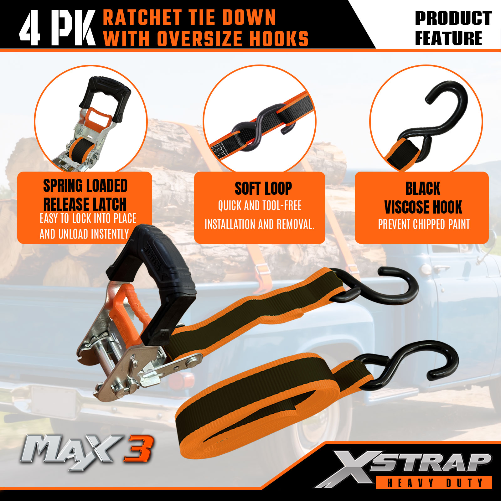 - Übergroße Schutzbeschläge: Ausgestattet mit großen, schwarz viskos beschichteten S-Haken, die Lacksplitter und Kratzer an Fahrzeugen/Ladung verhindern; gepaart mit einer weichen Schlaufenbefestigung für die werkzeuglose und beschädigungsfreie Sicherung empfindlicher Gegenstände.