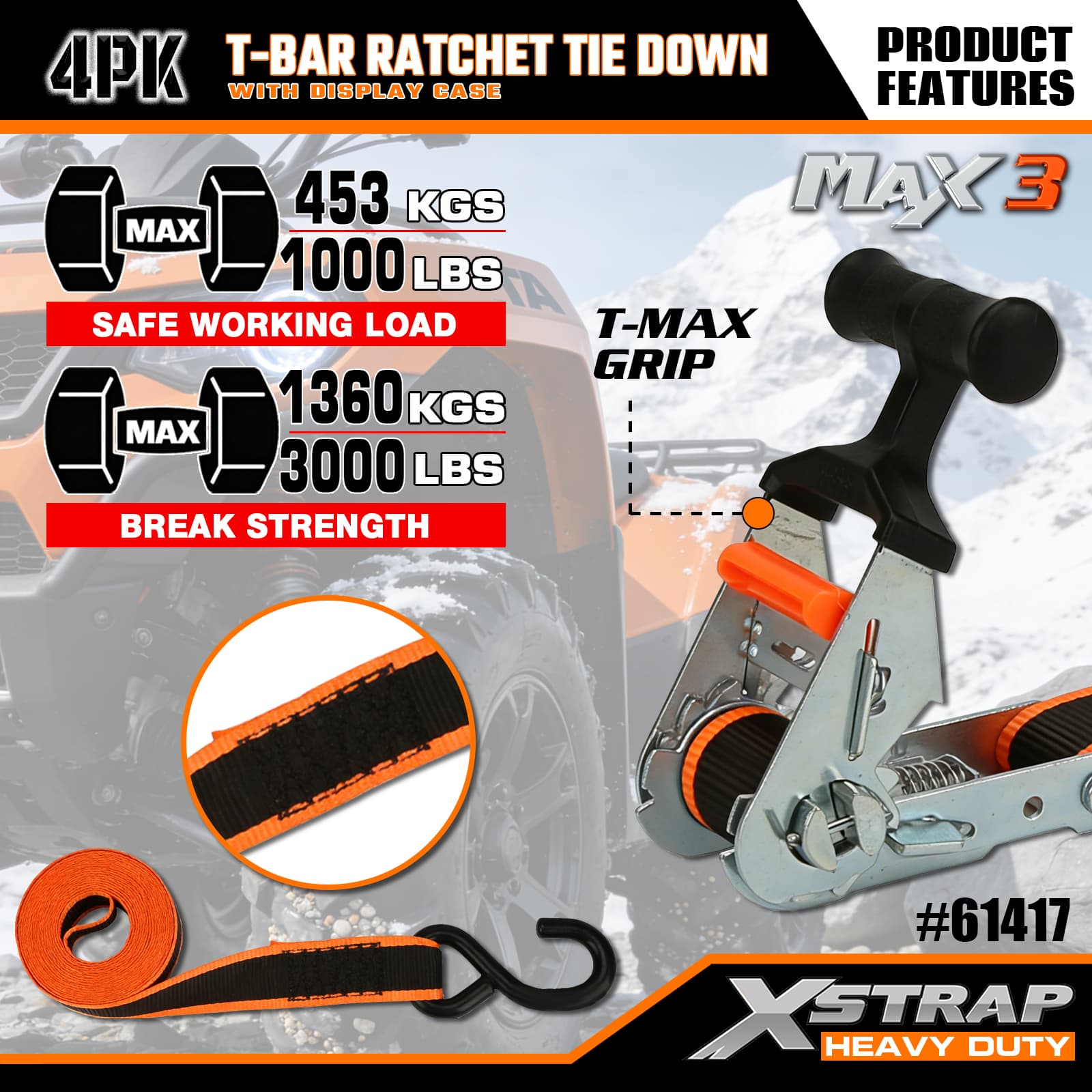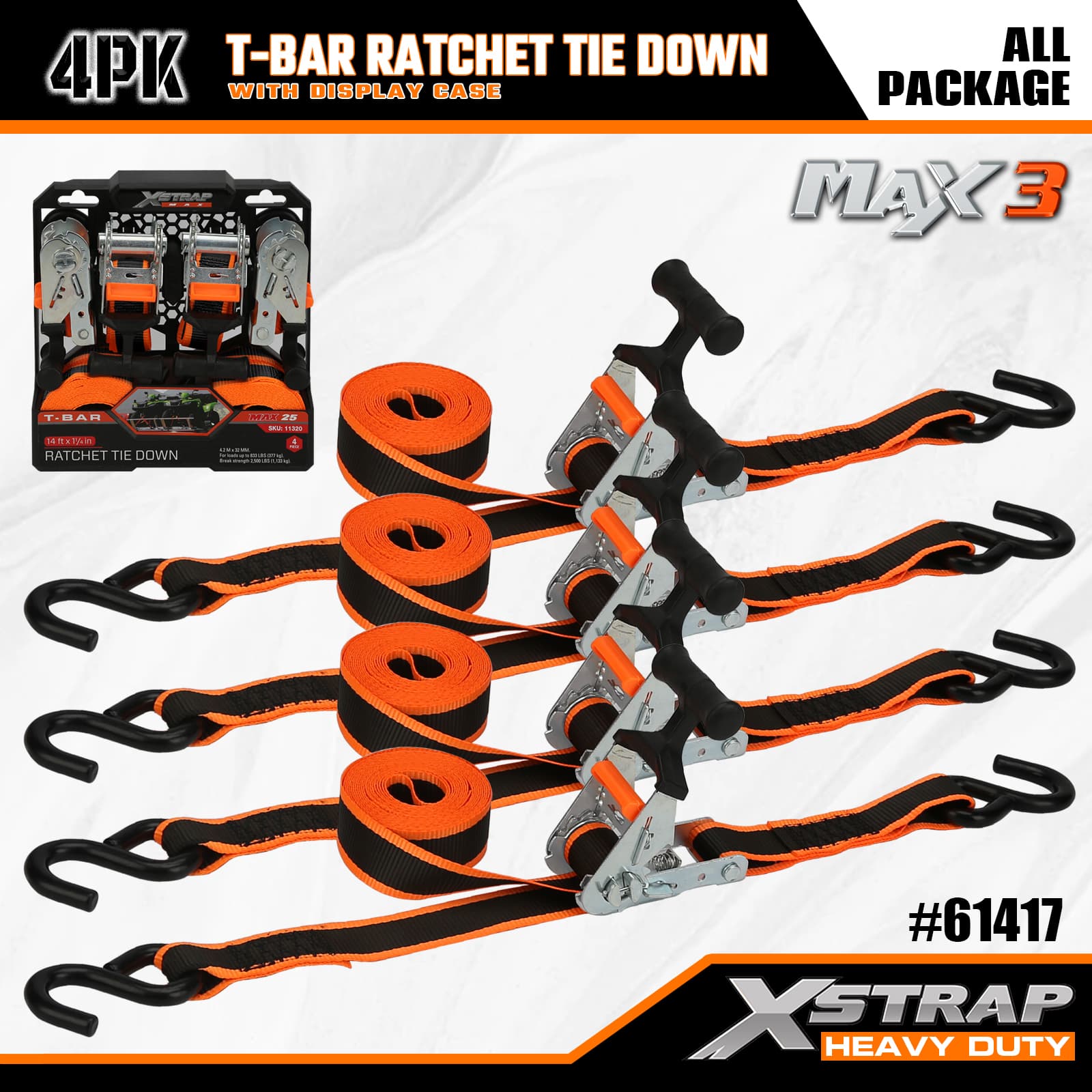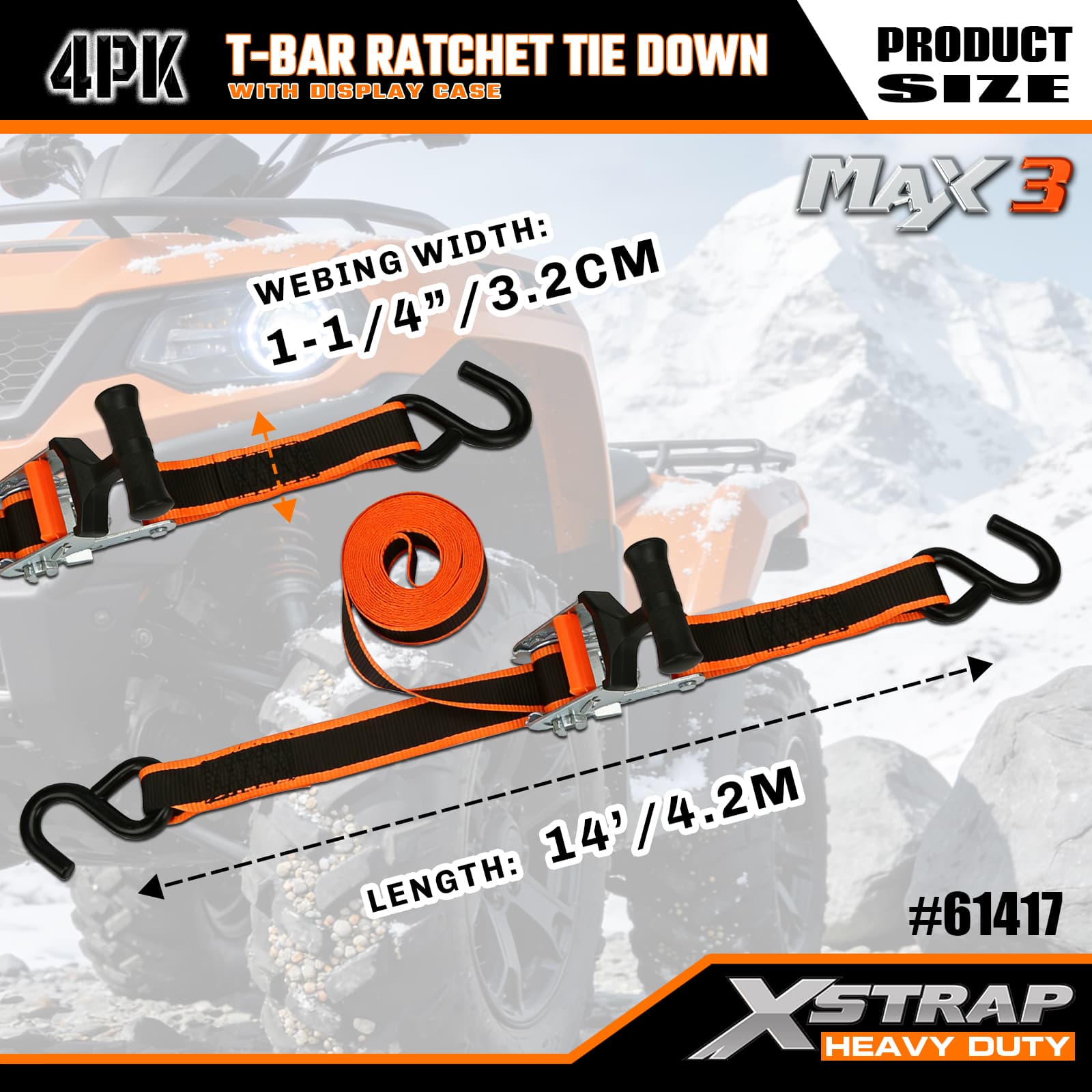 Xstrap 4er-Pack Ratschen-Spanngurt mit T-Max-Griff, 1-1/4 Zoll x 14 Fuß, Polyester-Spanngurt, Ratschengurt, 1.000 Pfund Kapazität, Ladungssicherungsgurte mit S-Haken, für Pickup-Truck, SUV, Autodachträger, Motorrad, leichtes Fischerboot, Jetski, Schneemobil, Rasentraktor.