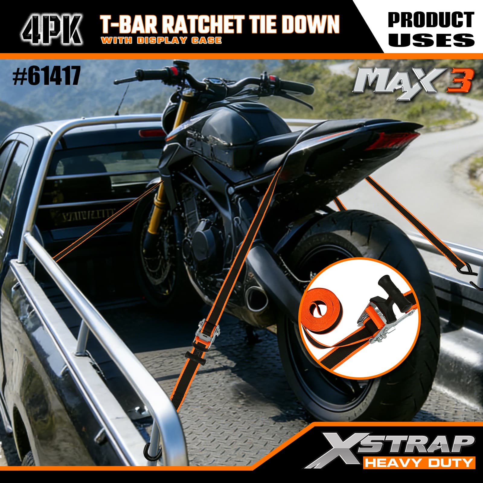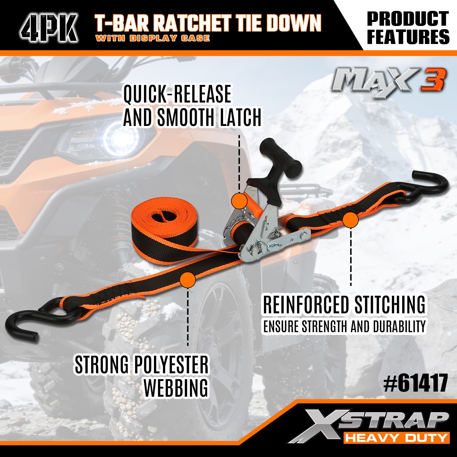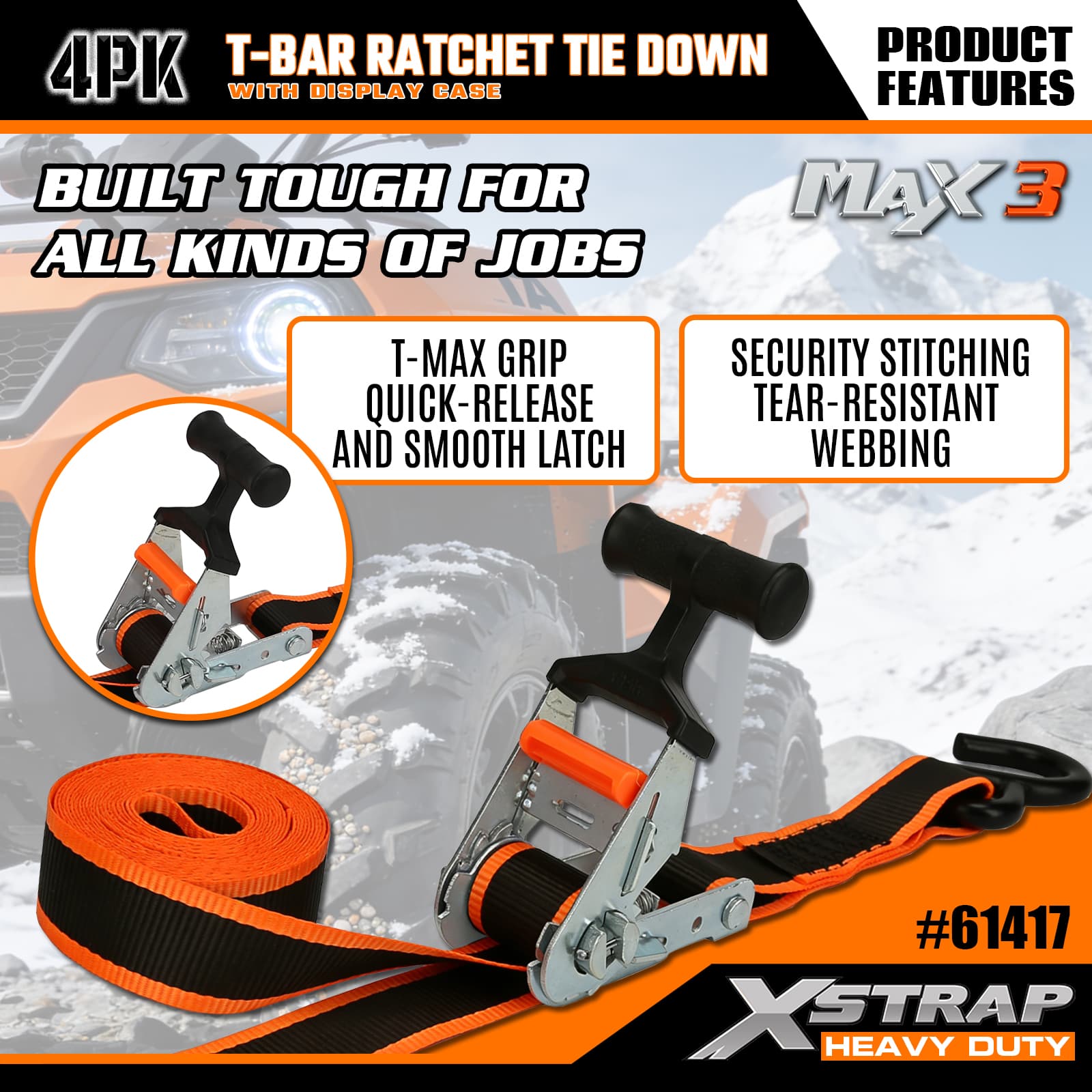 Xstrap 4er-Pack Ratschen-Spanngurt mit T-Max-Griff, 1-1/4 Zoll x 14 Fuß, Polyester-Spanngurt, Ratschengurt, 1.000 Pfund Kapazität, Ladungssicherungsgurte mit S-Haken, für Pickup-Truck, SUV, Autodachträger, Motorrad, leichtes Fischerboot, Jetski, Schneemobil, Rasentraktor.