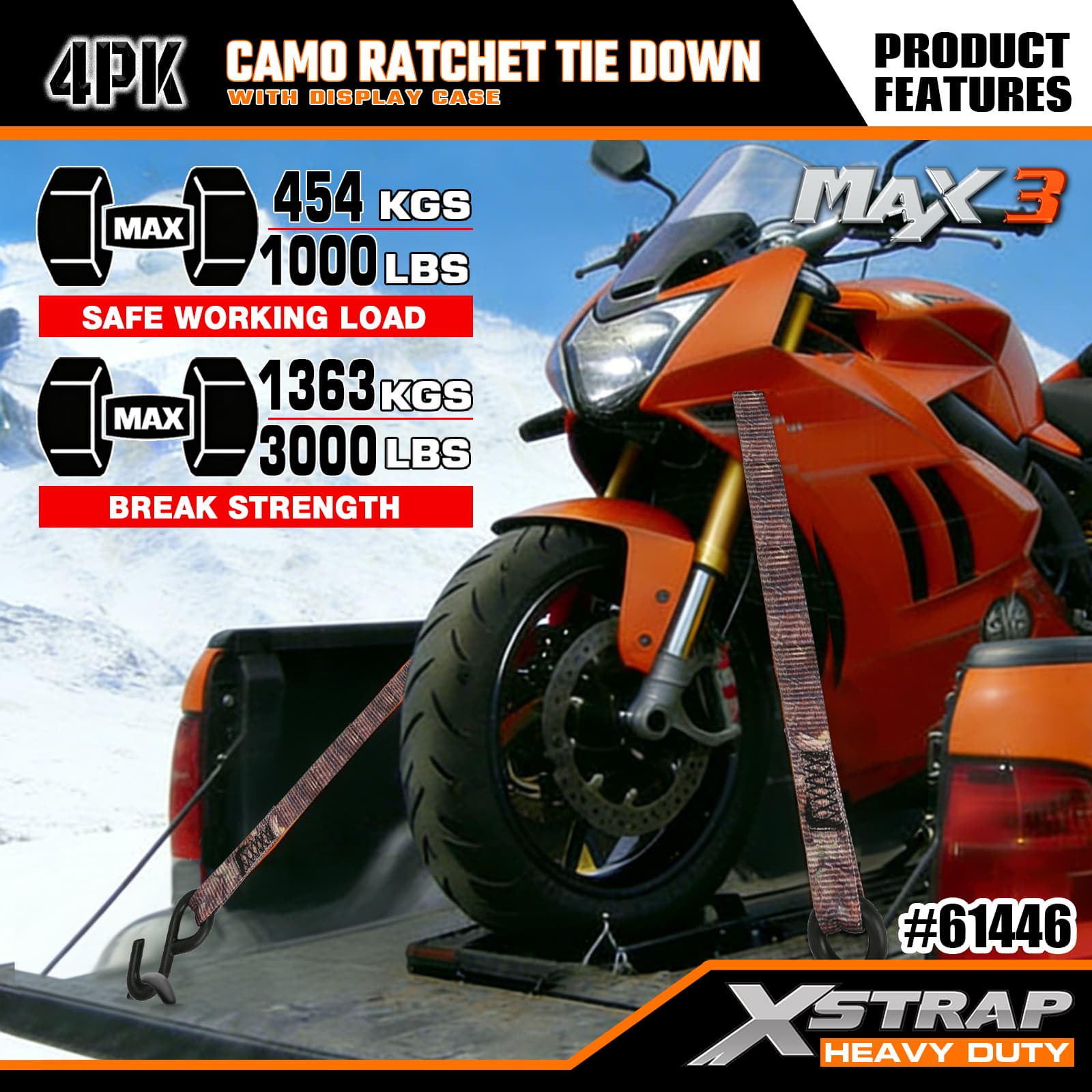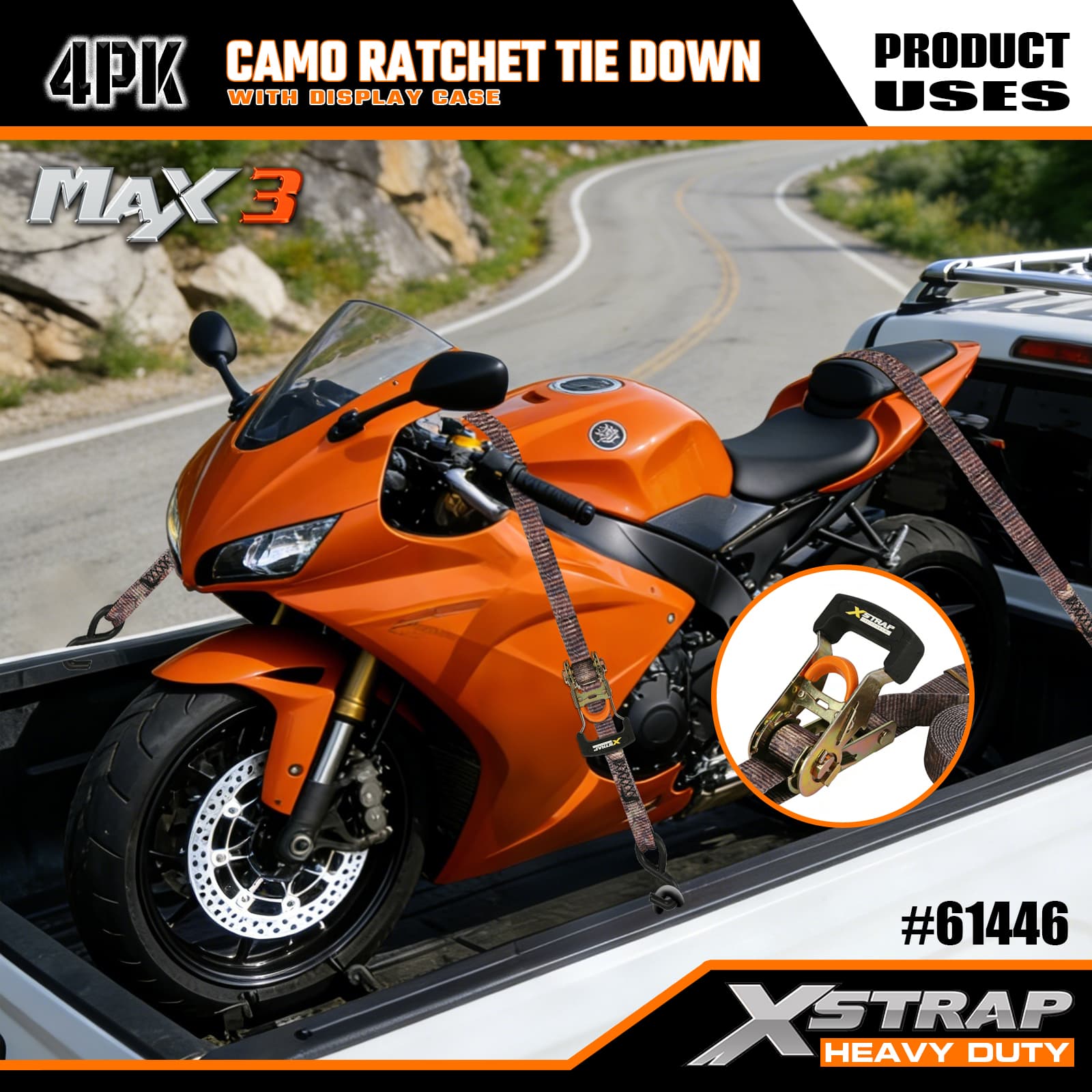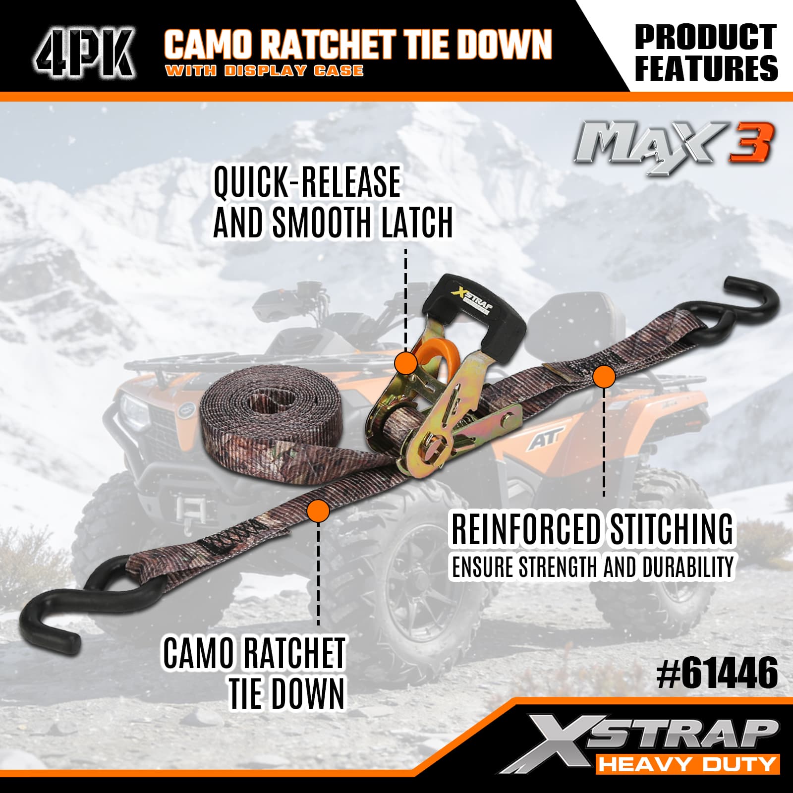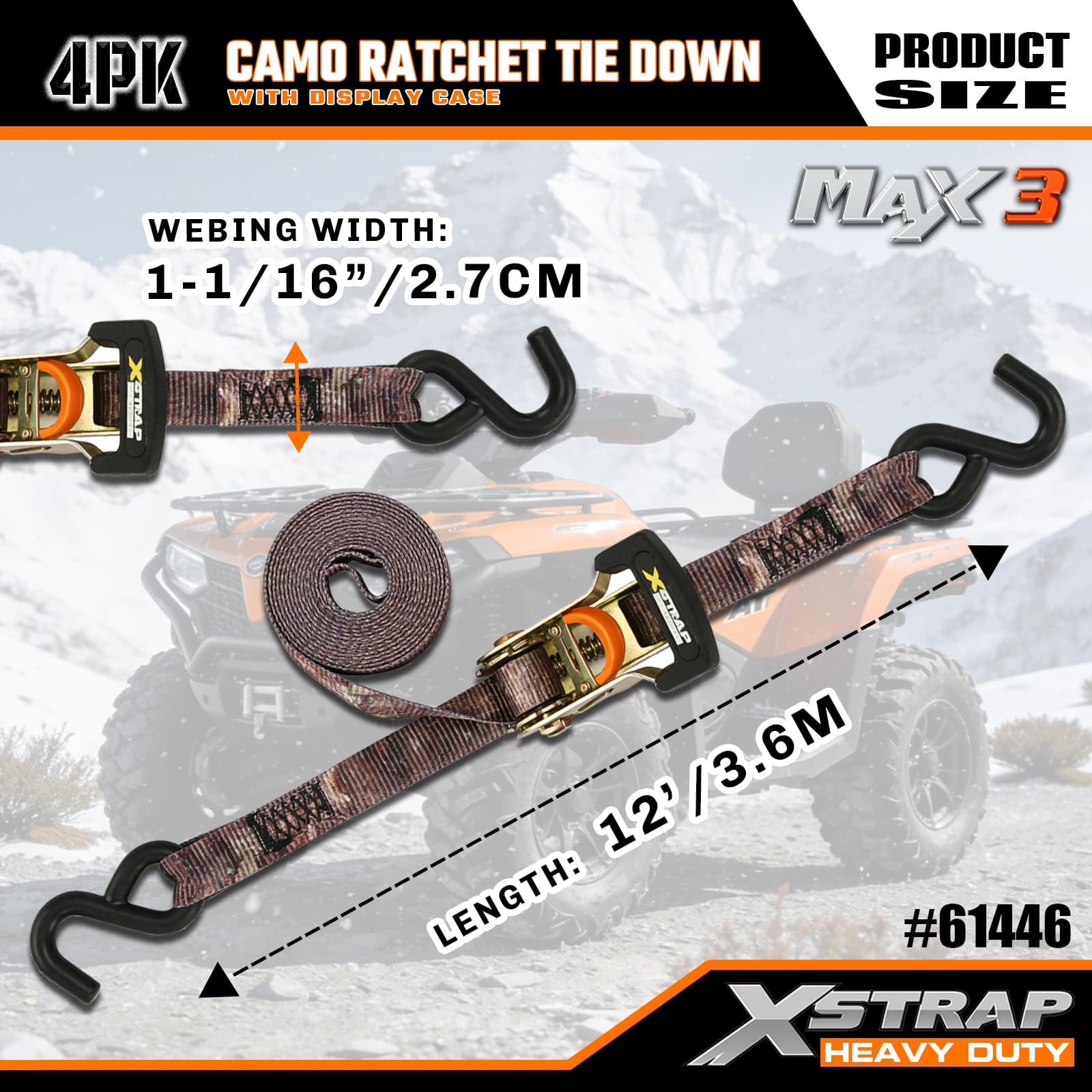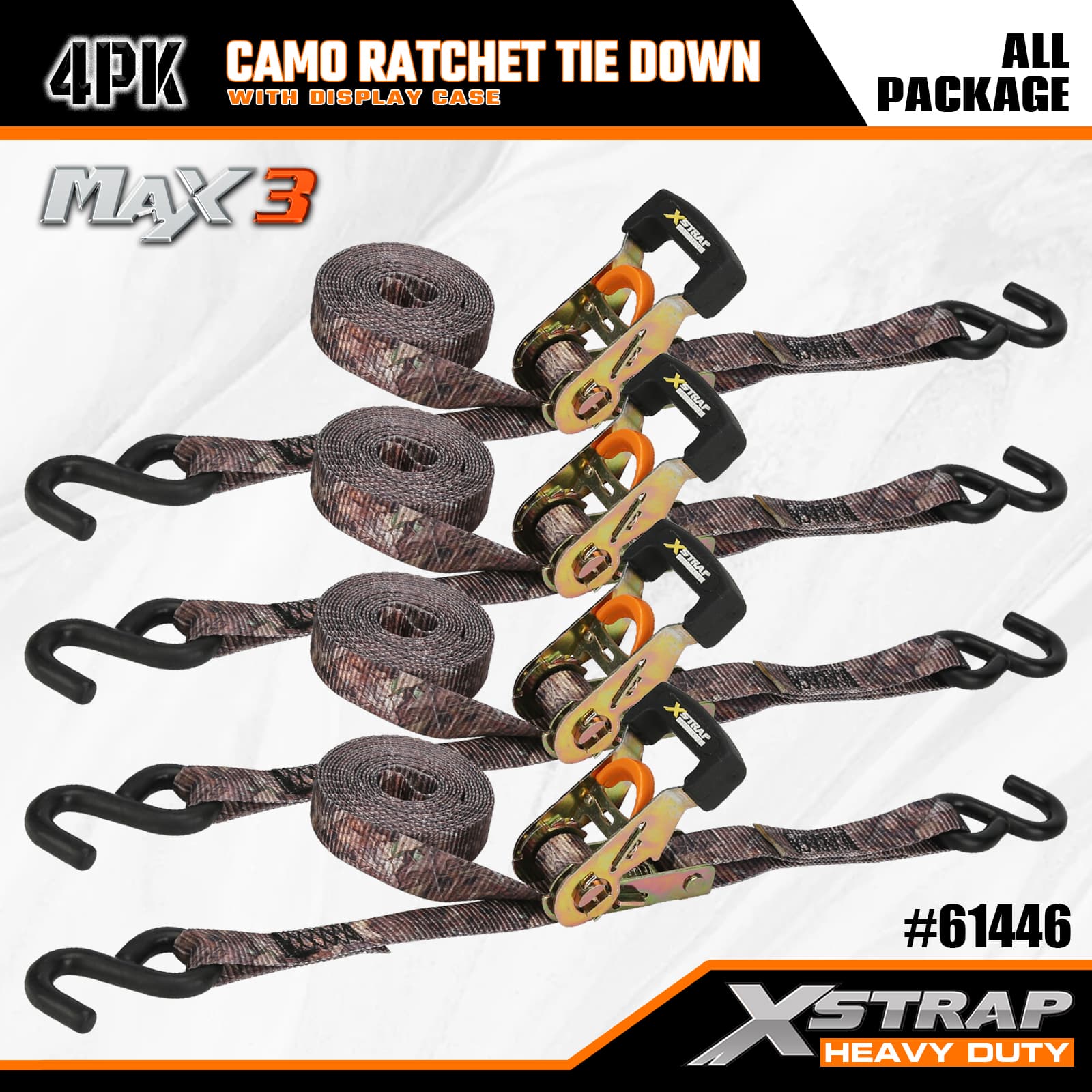 Xstrap 4er-Pack Camo-Ratschen-Spanngurt, 1-1/16 Zoll x 12 Fuß, Polyester-Spanngurt, Zugratschengurt, 1.000 Pfund Kapazität, Ladungssicherungsgurte mit S-Haken, für Pickup-Truck, SUV, Autodachträger, Motorrad, leichtes Fischerboot, Jetski, Schneemobil, Rasentraktor.