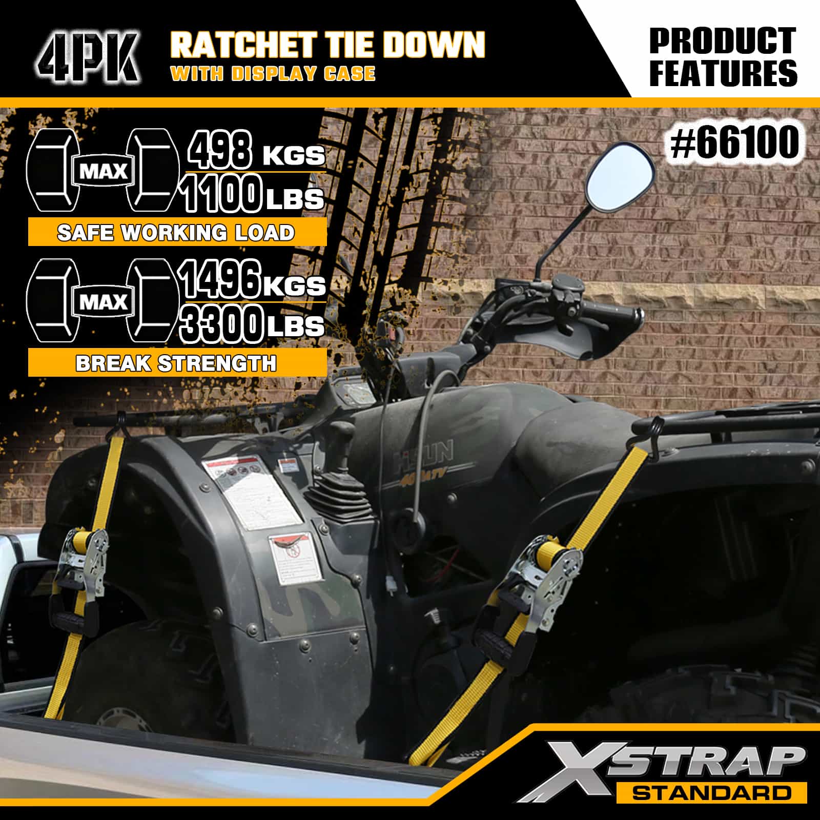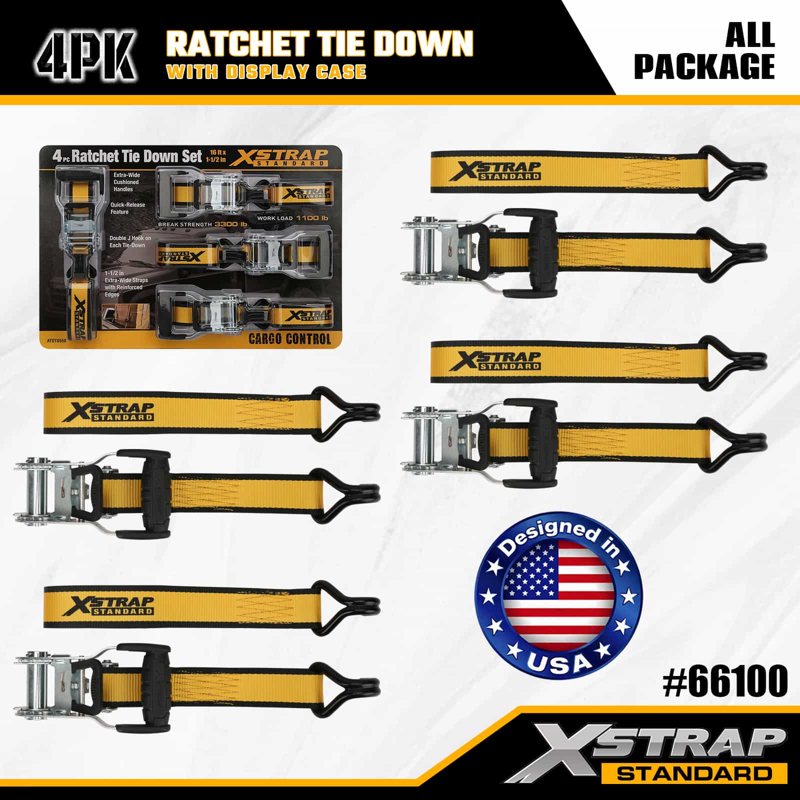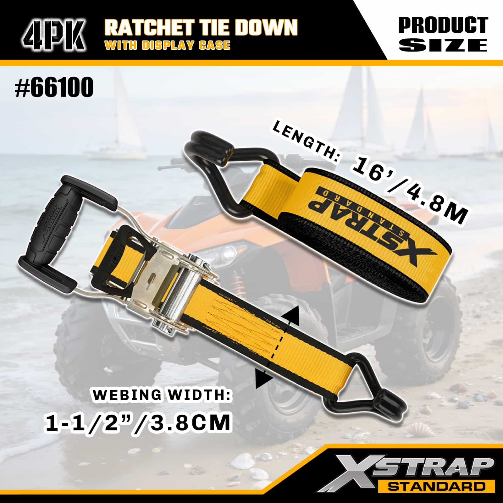 Xstrap 4er-Pack Ratschen-Zurrgurte mit Doppel-J-Haken, 1-1/2 Zoll x 16 Zoll Polyester-Zurrgurt, Zug-Ratschengurt, 1100 Pfund Kapazität, Ladungssicherungsgurte mit Doppel-J-Haken für Pickup-Truck, SUV, Autogepäckträger, Motorrad, leichtes Fischerboot, Jetski, Schneemobil, Rasentraktor.