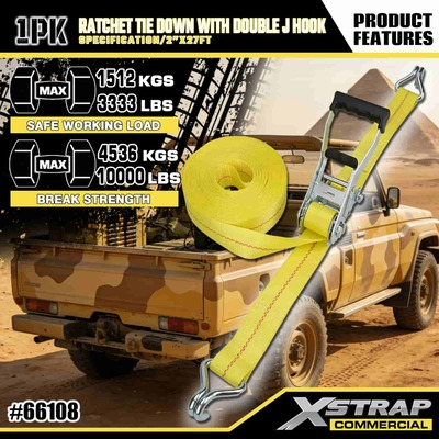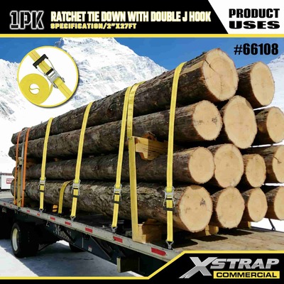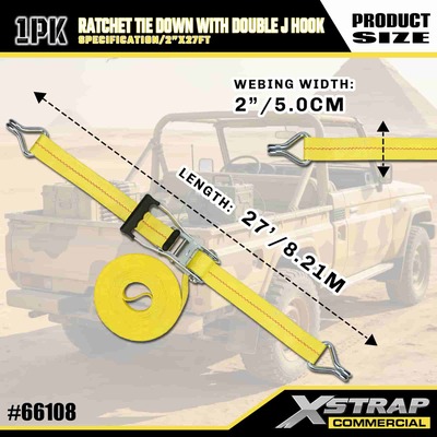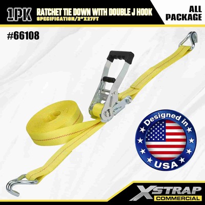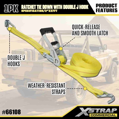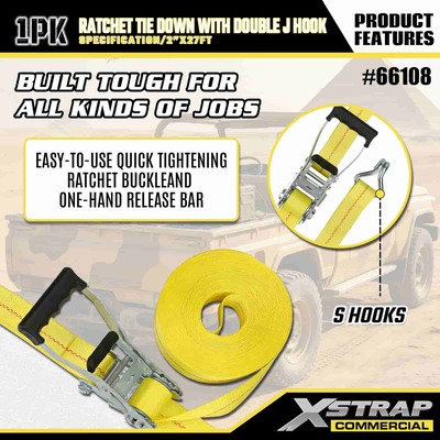 Xstrap Ratschen-Zurrgurt mit Doppel-J-Haken, 2 Zoll x 27 Fuß Polyester-Zurrgurt, Zugratschengurt, 3333 Pfund Kapazität, Zurrgurte zur Ladungssicherung mit Doppel-J-Haken zur Ladungskontrolle bei Pickup-Trucks, SUVs, Autodachträgern und Motorrädern.