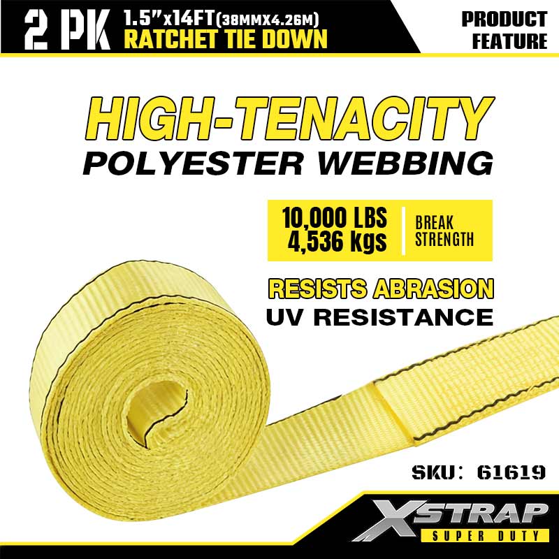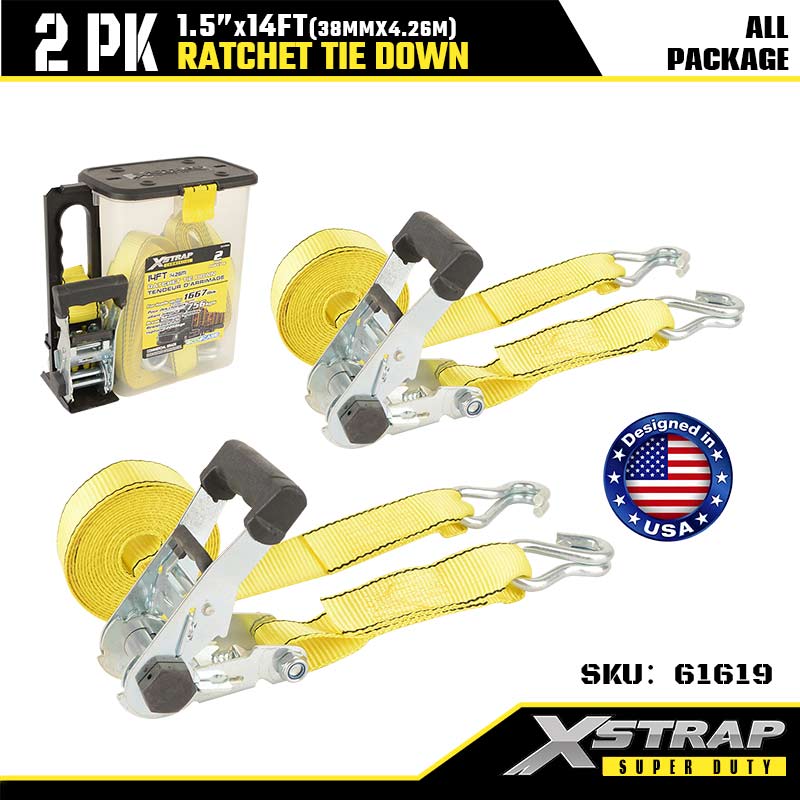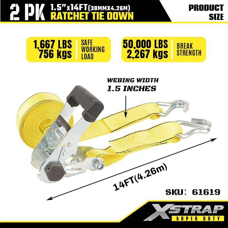 Xstrap Ratcet-Spanngurt mit Doppel-J-Haken, 1-1/2 Zoll x 14 Fuß, Ratschengurt aus Polyester, 1667 Pfund Kapazität, Zurrgurte mit Doppel-J-Haken für Schwerlastanhänger, Flachbettanhänger, Skiboot, Kleinwagen, schwere Ausrüstung.