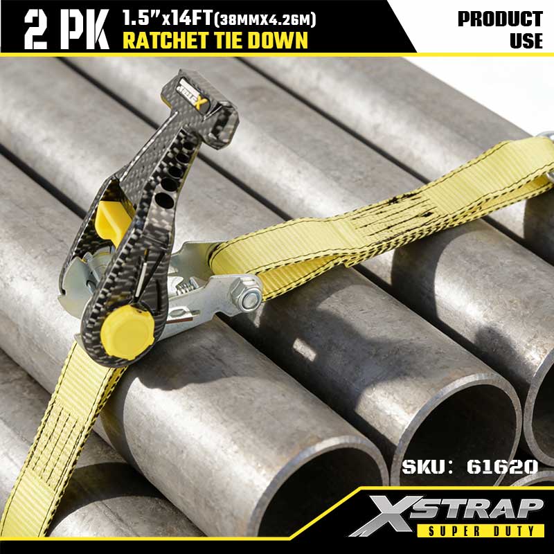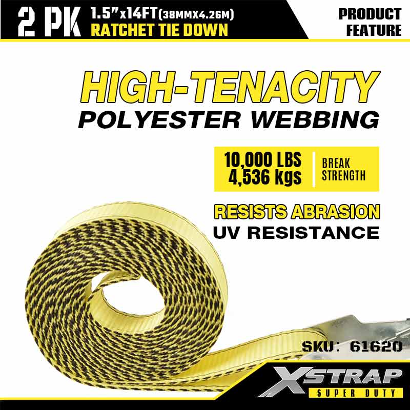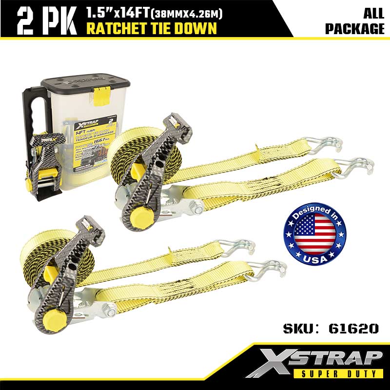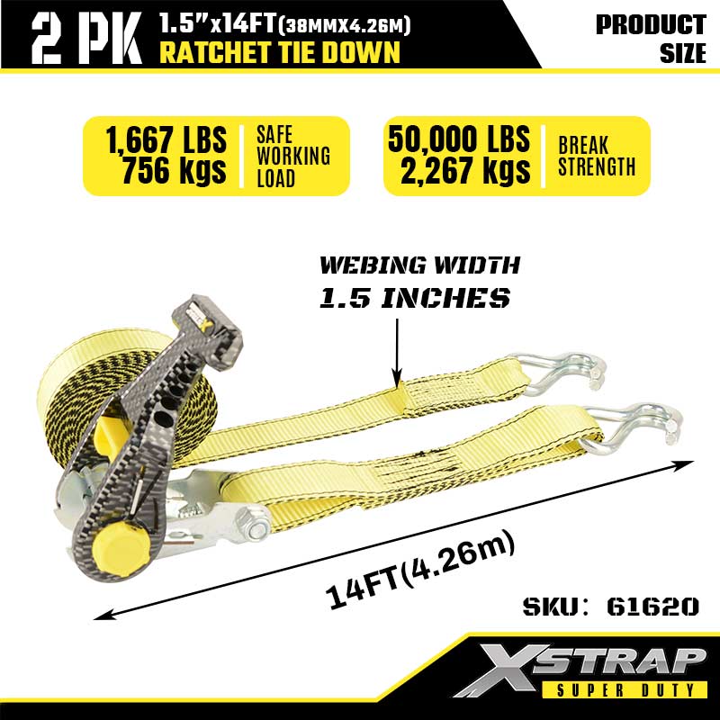 Xstrap Ratcet-Spanngurt mit Doppel-J-Haken, 1-1/2 Zoll x 14 Fuß, Ratschengurt aus Polyester, 1667 Pfund Kapazität, Zurrgurte mit Doppel-J-Haken für Schwerlastanhänger, Flachbettanhänger, Skiboot, Kleinwagen, schwere Ausrüstung.